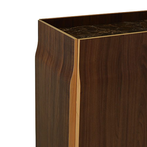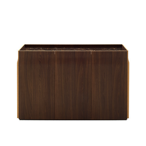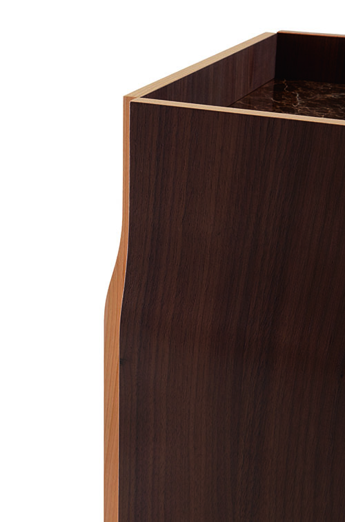 餐邊柜三間式有兩層,一層為單獨空間,另一層隔斷成兩個空間,餐邊柜四間式,雙層均隔斷成兩個空間。 餐邊柜有1個內部擱板,客廳家具有3個擱板。 茶幾十足精致。它有28個欄桿,每根欄桿底部寬,上部窄,以美國實心胡桃木制成,深色,涂清漆。每根欄桿都 由一個不可見的裝置固定,該裝置將其與地板連接,確保達到預期的堅固性。在頂層平板下方水平狀的配接板條 連接并固定了欄桿,它起始于最邊緣的欄桿,并向外連接其他欄桿。下部空間似乎沒有任何分隔,只有中央正方形物體鞏固了整體,加上67千克沉重的大理石托盤的重量,使整體 重達121千克——從外觀上卻看不出這個分量。中心覆蓋著深色胡桃木貼面與下部托盤的巧克力色漆形成鮮明對 比。它安裝在可調式地板墊 上,將其抬離地面20毫米。