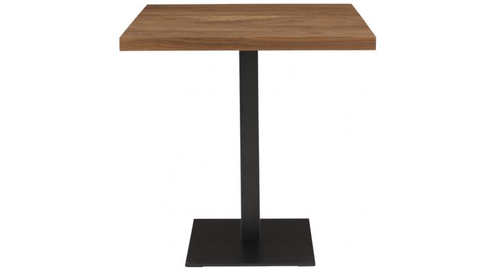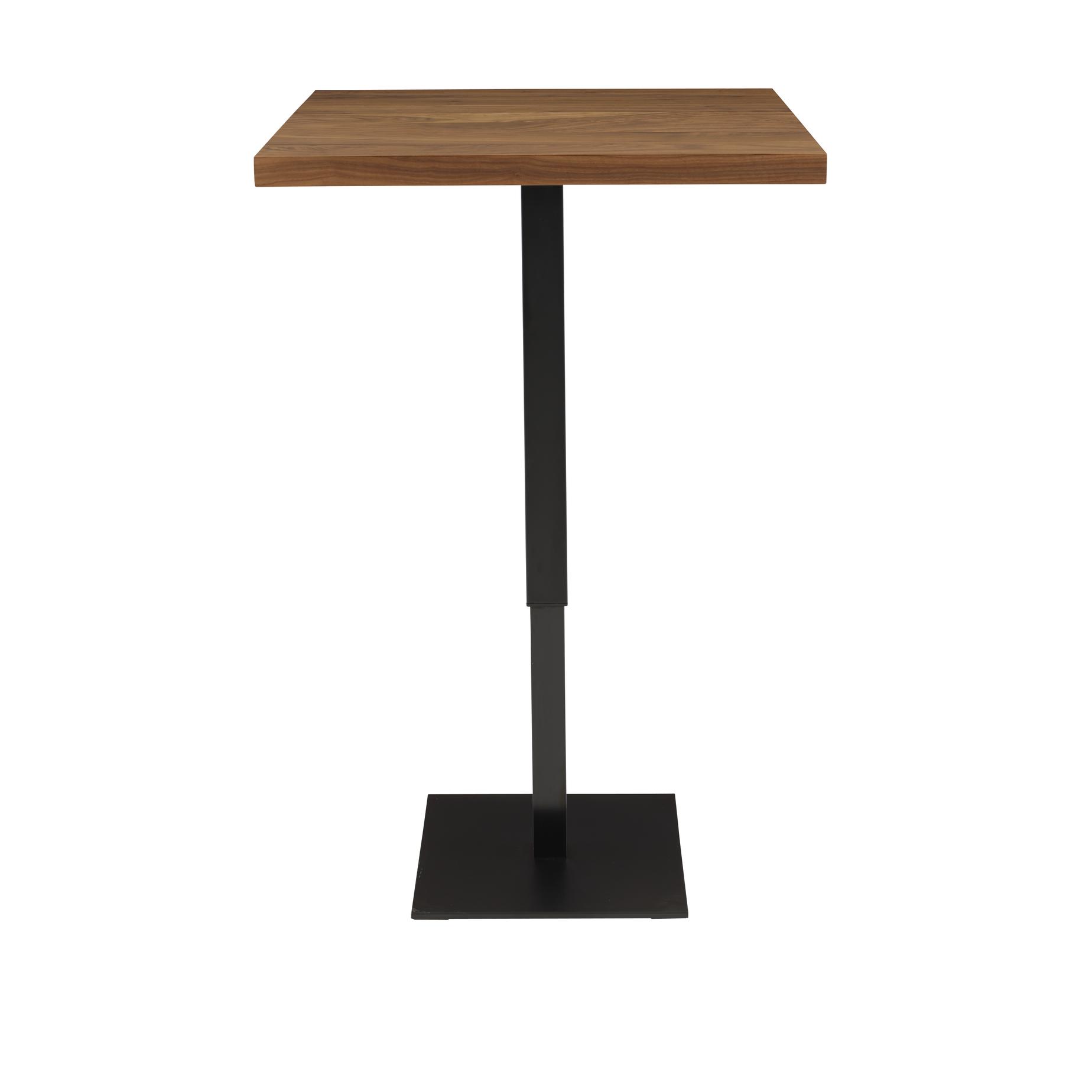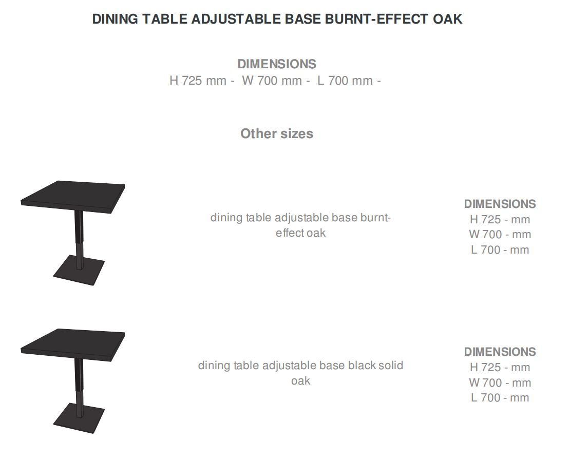Dining table with 3.8 cm solid wood top and 47 x 47 x 1 cm black lacquered steel base. The base may be adjusted to vary the height of the top between 72.5cm and 110.5 cm. The lower fixed part of the central base is in 5 x 5 cm square- section black zinc-coated steel; the upper sliding section is in 6 x 6 cm square-section black lacquered steel. Max. load 80 kg (when centred, or 30 kg on the edges).