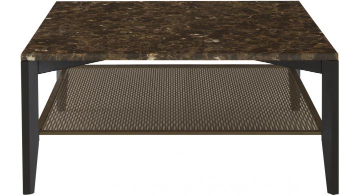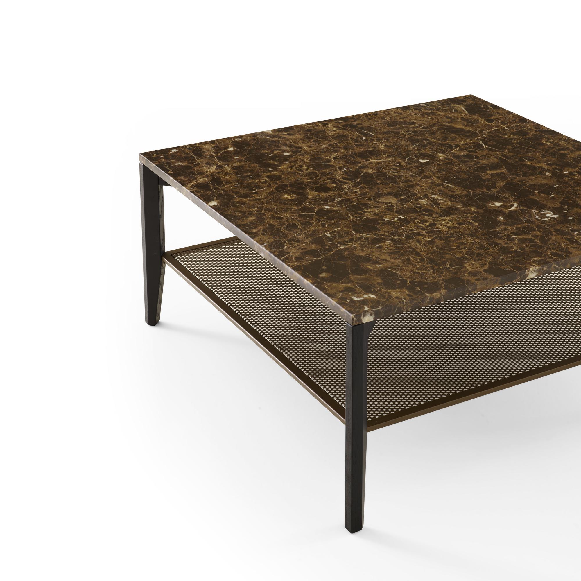 Marie-Aurore Stiker-Metral’s new double-deck low table presents a lower surface in sheet steel delicately perforated with small circles, the bronze lacquer finish of which confers just the right preciosity to contrast with the richness of the upper top in brilliant-polished marble. The two tops, made from cold, glossy materials (steel and marble), are warmed by their colouring (bronze lacquer for the steel and corsé or verde for the marble) and by the structure/base which holds them together, made from matt black- stained solid ash with a visible grain. Two-deck low table. Structure and bevelled base in black-stained solid ash. Lower top in bronze lacquered sheet steel with round perforations and a solid border. Upper top in verde or corsé-coloured marble, brilliant-polished and with stain-resistant treatment, and with honed edges.