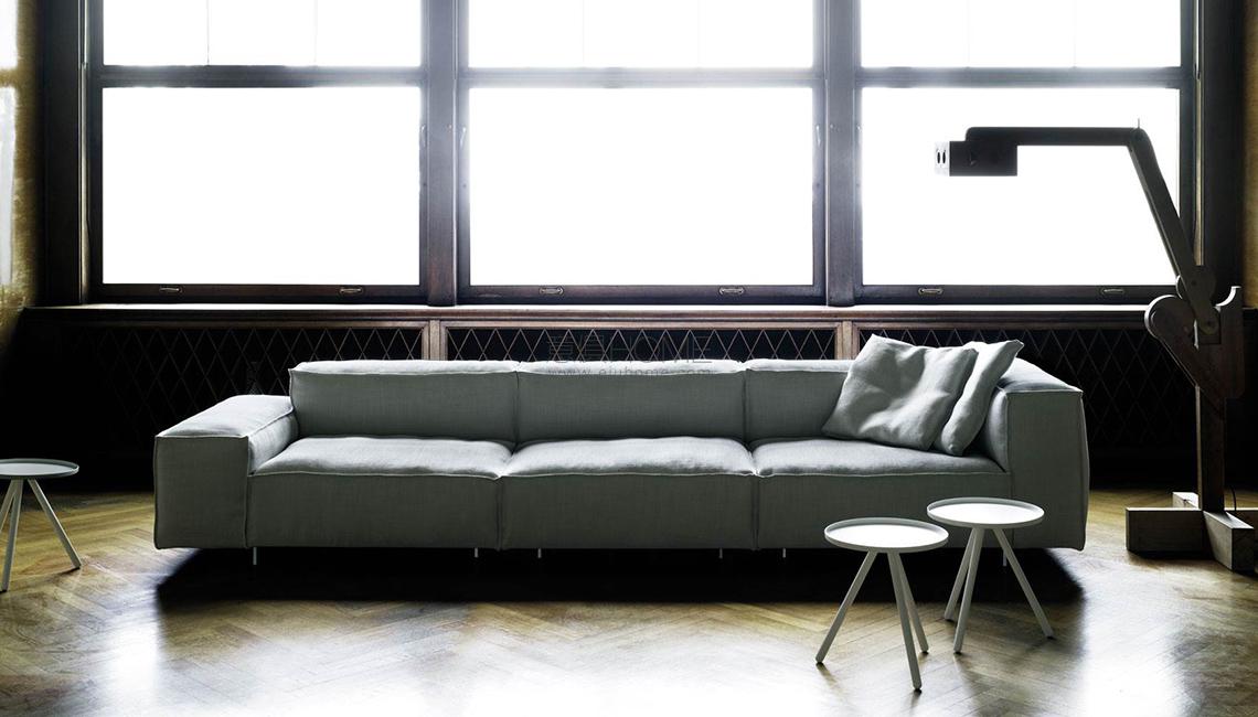 Different modular elements. Frame in double-paneled poplar and pine. Cross-woven, coated rubber elastic straps. Padding in differentiated density polyurethane foam covered with a quilted mat in prewashed and sterilized goose down, stitched into separated compartments or in differentiated density polyurethane foam and visco-soft “Xtra-pur” covered with acrylic fibre layers. Black adjustable PVC feet or in stainless steel, with matt satin-finish. Fabric or leather upholstery, both fully removable by Velcro fastenings. The various elements are joined together by means of hooks. Seat depth 68-94cm.