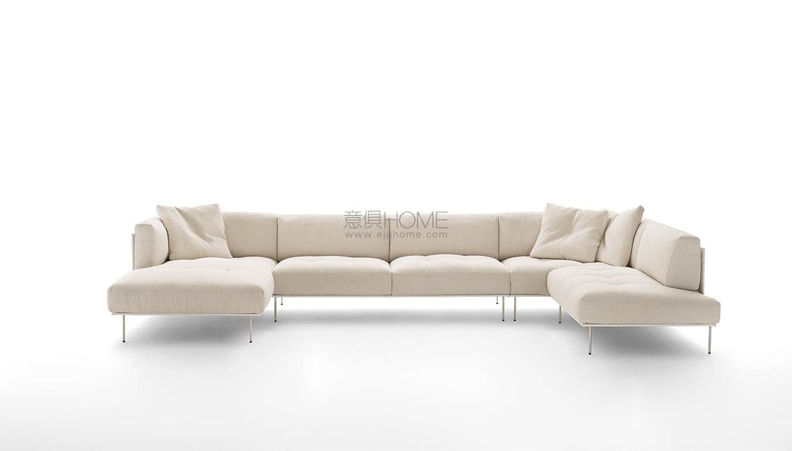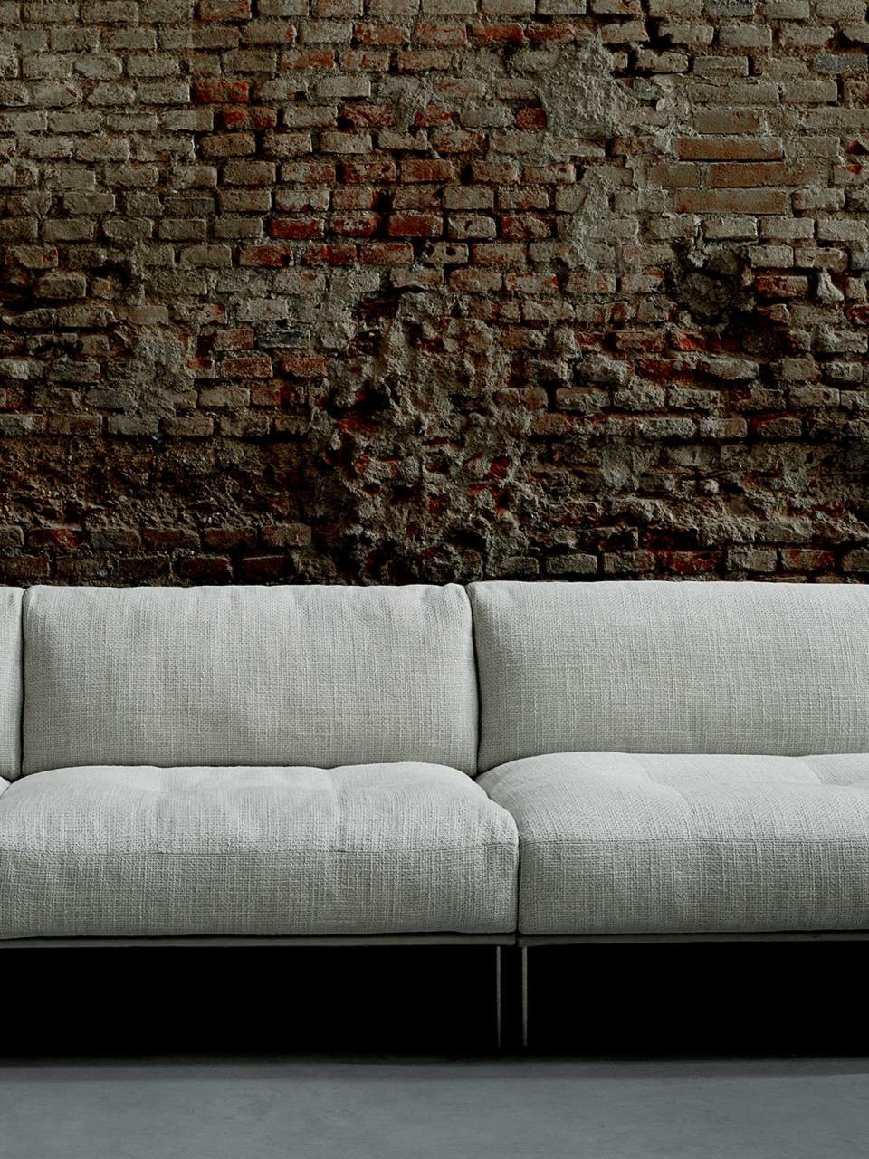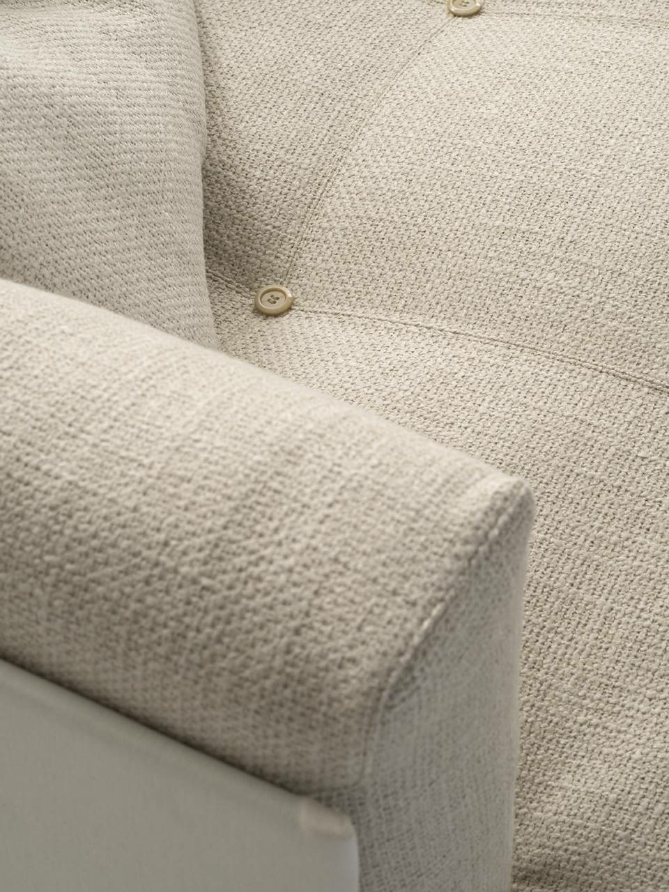 Supporting structure in lacquered drawn tubular steel, seat sprung with coated rubber elastic straps and polyurethane foam. Backrest and armrest structure in self-supporting decorative HPL panel. Covering in 100% polyether, thermally bonded onto a polyamide velveteen backing. Backrest and seat cushions in prewashed and sterilized goose down, with polyurethane foam insert. The seat cushions are quilted with buttons at sight or, on request, quilted without buttons. Armrest cushions in polyurethane foam covered with prewashed and sterilized goose down, with a poplar plywood supporting panel fixed to the frame by plug-in hinges. Stainless steel feet, polished or matt satin-finish, screwed to the base with a bushing. Fabric or leather upholstery, both fully removable by zippers and Velcro fastenings.