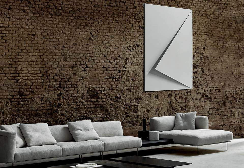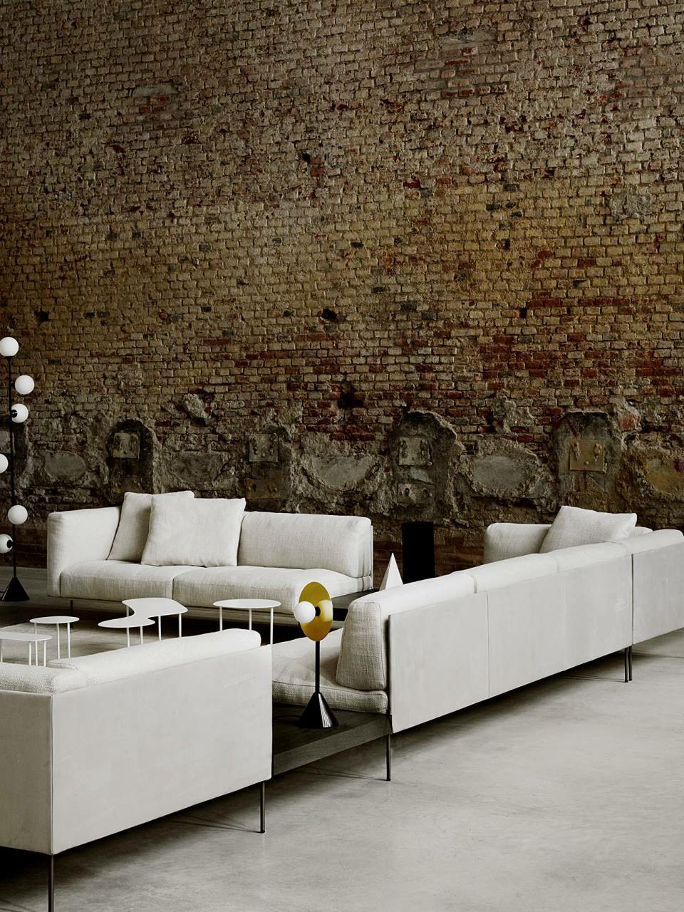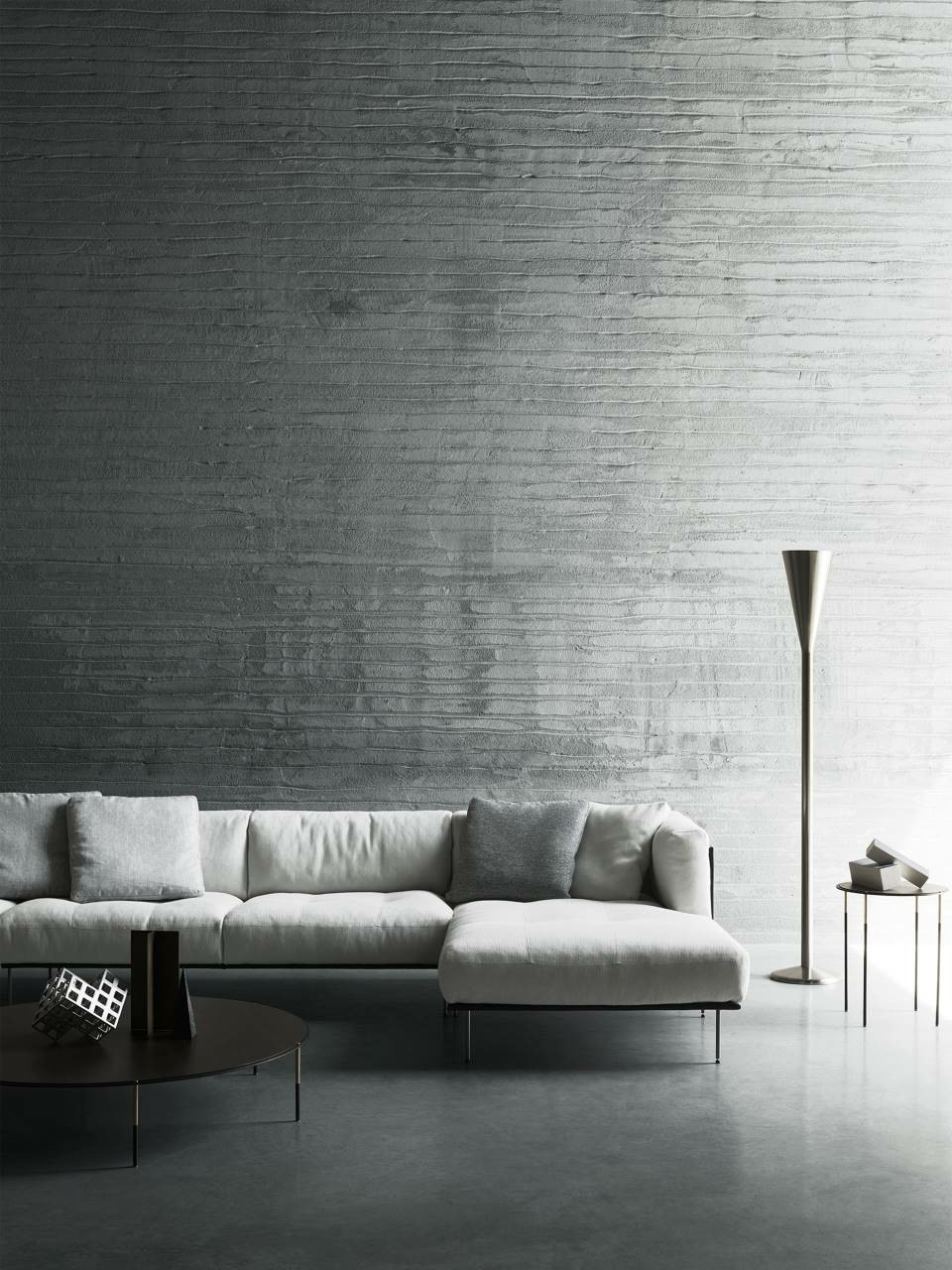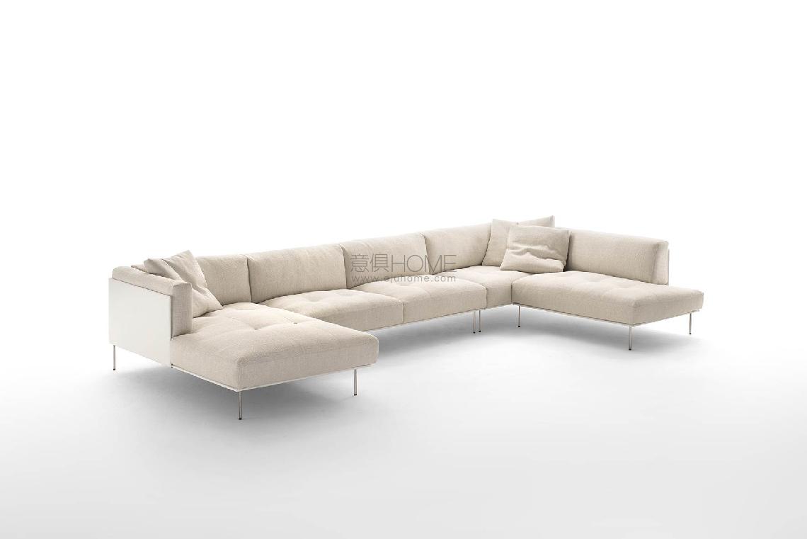 Supporting structure in lacquered drawn tubular steel, seat sprung with coated rubber elastic straps and polyurethane foam. Backrest and armrest structure in self-supporting decorative HPL panel. Covering in 100% polyether, thermally bonded onto a polyamide velveteen backing. Backrest and seat cushions in prewashed and sterilized goose down, with polyurethane foam insert. The seat cushions are quilted with buttons at sight or, on request, quilted without buttons. Armrest cushions in polyurethane foam covered with prewashed and sterilized goose down, with a poplar plywood supporting panel fixed to the frame by plug-in hinges. Stainless steel feet, polished or matt satin-finish, screwed to the base with a bushing. Fabric or leather upholstery, both fully removable by zippers and Velcro fastenings.
