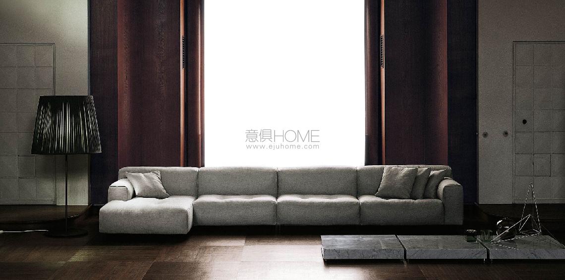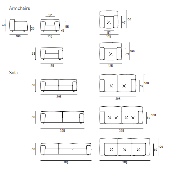 Fix or modular sofa and armchair. Base frame in lacquered steel with support in coated rubber elastic straps and felt pad to protect the seat cushion. Armrest and backrest with steel frame and elastic straps, embedded in a cold-expanded polyurethane foam structure, covered with a mat in prewashed and sterilized goose down, stitched into separate compartments. Seat cushions with preformed structure in differentiated density polyurethane foam, covered with a mat in prewashed and sterilized goose down, stitched into separate compartments. Black anodized aluminum feet, adjustable on 3 levels, from 7cm to 10cm or, on request, available with a chromed steel base. Fabric or leather upholstery, both fully removable by zippers and Velcro fastenings. Seat depth 67cm.
