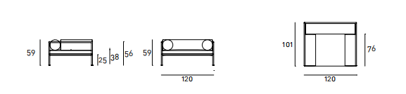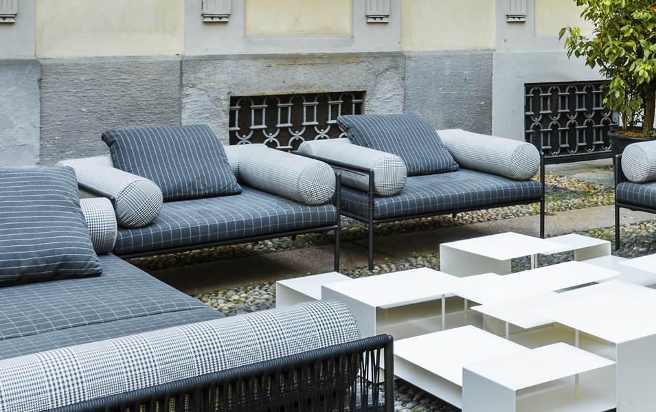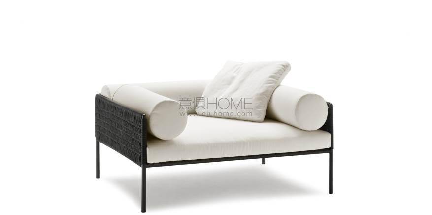 Armchair, sofas and day bed available for indoor and outdoor, both in the “Light” version - structure only - or with weaving in the materials available in the collection. Indoor version: tubular steel frame ?25mm with epoxy powder coating gunmetal color, woven with full background motif, warp and weft, in cellulose cord. Seat chassis in tubular steel, section 40x30mm, with epoxy powder coating, screwed to the structure, sprung with coated rubber elastic straps with padding in polyurethane foam covered in 100% polyether thermally bonded onto a polyamide velveteen backing. Seat cushions, in different density polyurethane foam, and bolster cushions for backrests and armrests, in polyurethane foam, covered with acrylic fiber layers. Leather or fabric upholstery. Outdoor version: tubular frame ?25mm in Stainless Steel AISI 316 with matt satin finish or with a galvanizing base for outdoor with epoxy polyester powder coating gunmetal color, woven in waxed rope (? 5mm) in the finishing available in the collection. Seat chassis, screwed to the frame, in 40x30mm Stainless Steel, sprung with coated rubber elastic straps, with stainless steel hooks. Padding with open-cell structure polyurethane foam DRYFEEL S and fibre for outdoor, coated with heat- sealed waterproof fabric protection. Seat cushions and bolster backrests and armrests cushions, padded with open cell structure polyurethane foam DRYFEEL S and fibre for outdoor, covered with heat- sealed waterproof fabric. Upholstery with outdoor fabrics only. For both versions, upholstery fully removable by zippers and Velcro fastenings. Floor support secured by black PVC feet.