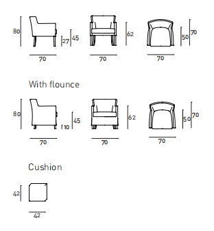 Armchair with one-piece frame in double-panelled beech, poplar and pine. Support in coated rubber elastic straps. Padding in cold-expanded polyurethane foam and differentiated density polyurethane foam. Covering in 100% polyether thermally bonded onto a polyamide velveteen backing. Seat cushion in prewashed and sterilized goose down. Legs in natural beech or, on request, with cherry-wood or walnut finish. Fabric or leather upholstery. The fabric version only is available with flounce 10cm from the floor and is fully removable by zippers and Velcro fastenings. The leather version is always without flounce and non-removable upholstery. Seat depth 50cm.