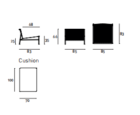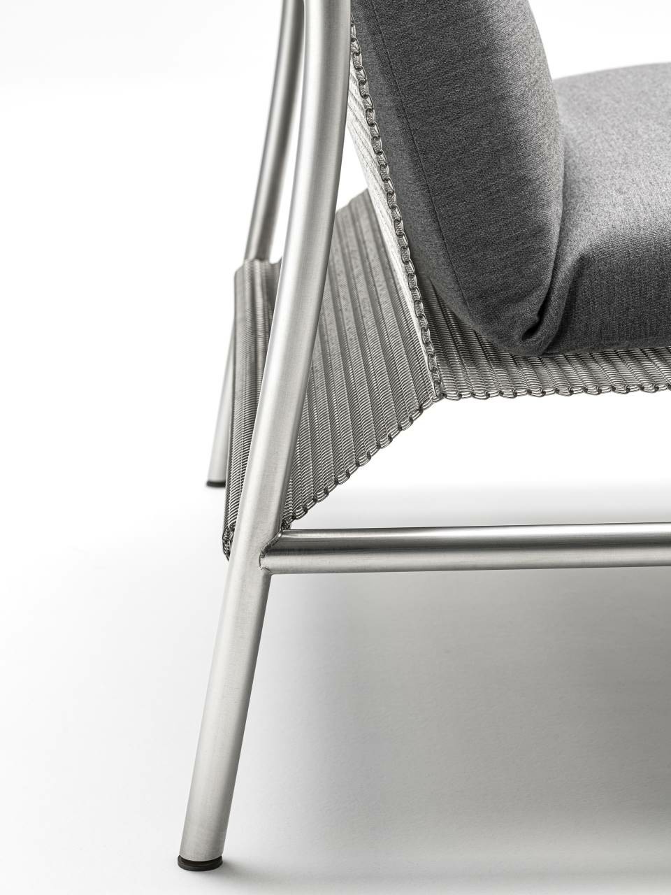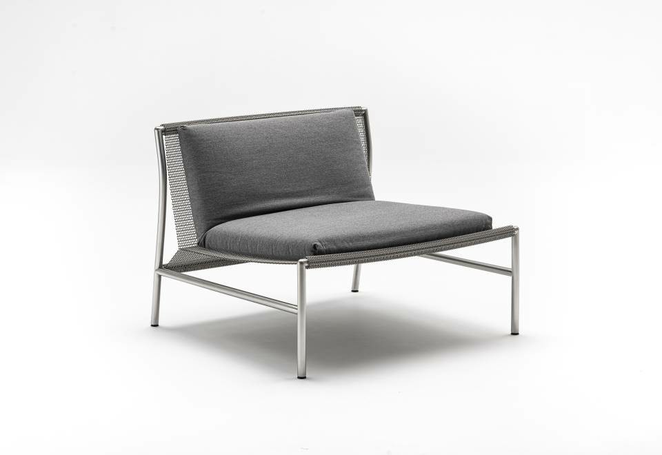 Armchair available for indoor and outdoor. Supporting structure in AISI 316 stainless steel with matt satin-finish. Swivelling nylon tips. AISI 316 stainless steel mesh. Indoor: seat cushion in differentiated density polyurethane foam, coated with acrylic fibre layers. Outdoor: seat cushion in open cell structure polyurethane foam FILTREN?T. Upholstery with outdoor fabrics only. Cushions’ upholstery, in both versions, fully removable by zippers. Seat depth 68cm.