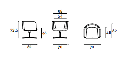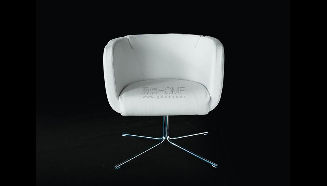 Armchair with steel frame embedded in cold-expanded polyurethane foam. Seat support in coated rubber elastic straps. Covering in needle punched, resinated, nonwoven polyester fibre, bonded onto a polyamide velveteen backing. Seat cushion in polyurethane foam, covered with acrylic fibre layers. Swiveling base in chromed finish steel or in steel laquered gunmetal grey colour. Floor support secured by with white or black PVC tips. Fabric or leather upholstery. The fabric version only is fully removable by zippers and Velcro fastenings, unscrewing the under seat cover in impact-resistant polystyrene. Seat depth 48cm.