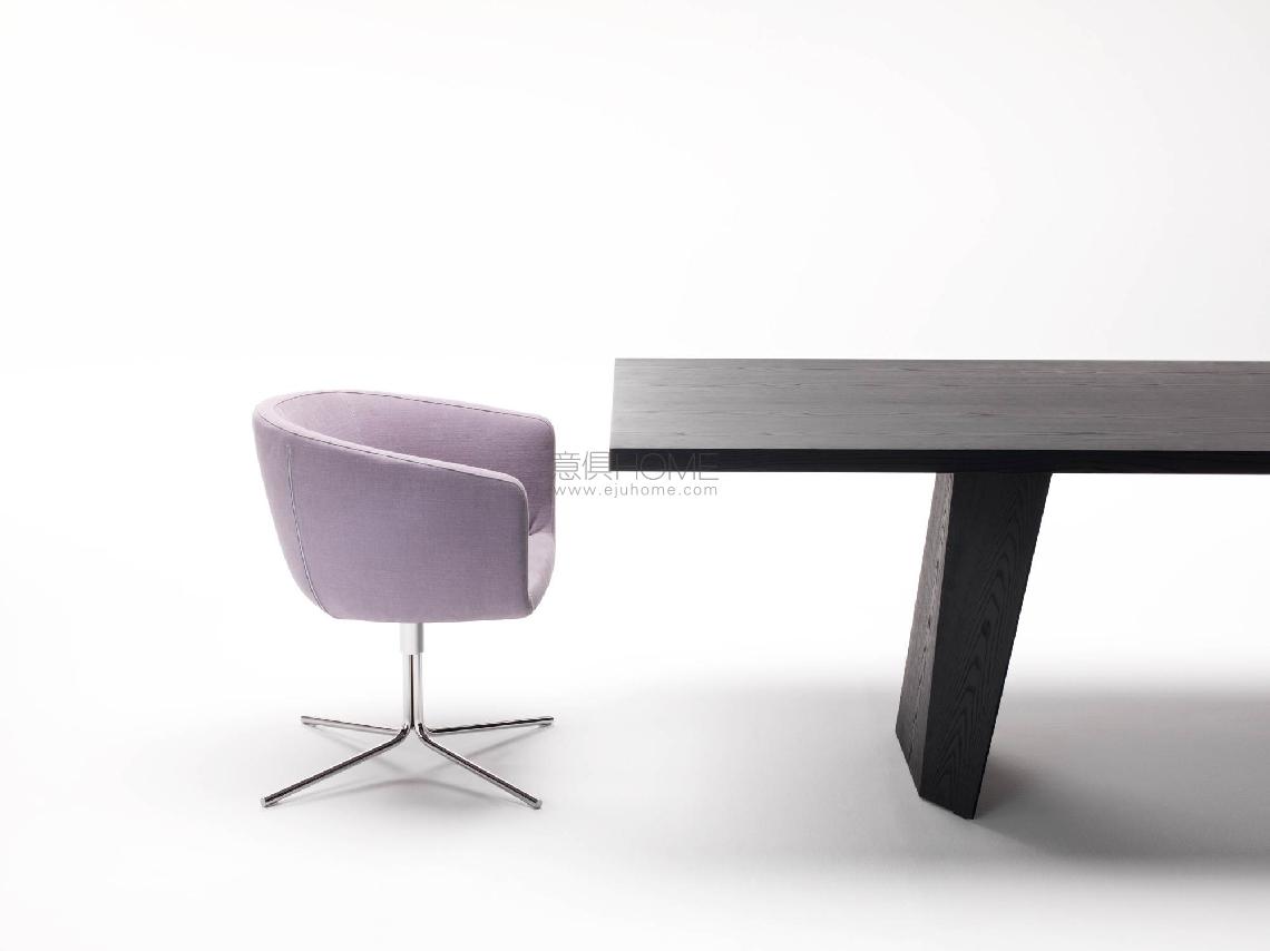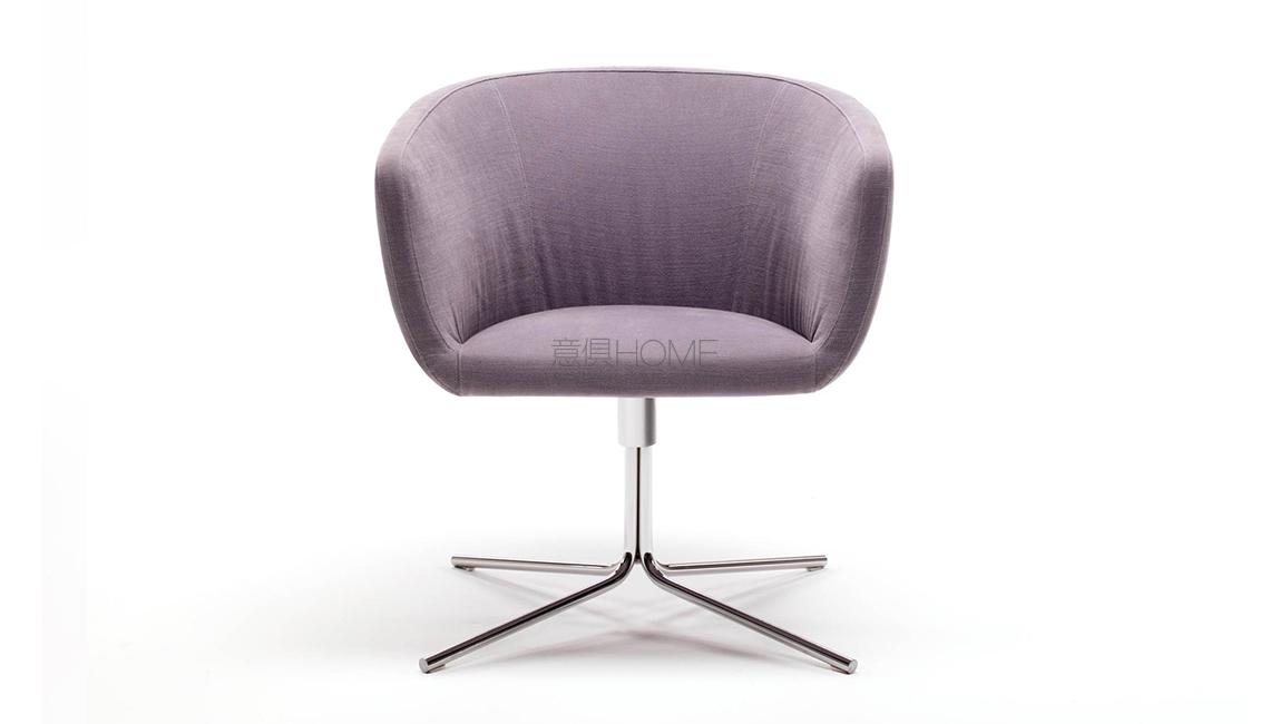 Small armchair with one-piece frame with steel insert and flexible, cold-expanded polyurethane foam padding and seat padded with polyurethane foam. Covering in needle punched, resinated, non-woven polyester fibre, bonded onto a polyamide velveeten backing. Swiveling base in shiny chromed finish steel or in steel lacquered in gunmetal grey colour and floor support secured by white or black PVC tips. Fabric or leather upholstery; the fabric version only is fully removable by zippers and velcro fastenings. Seat depth 41cm
