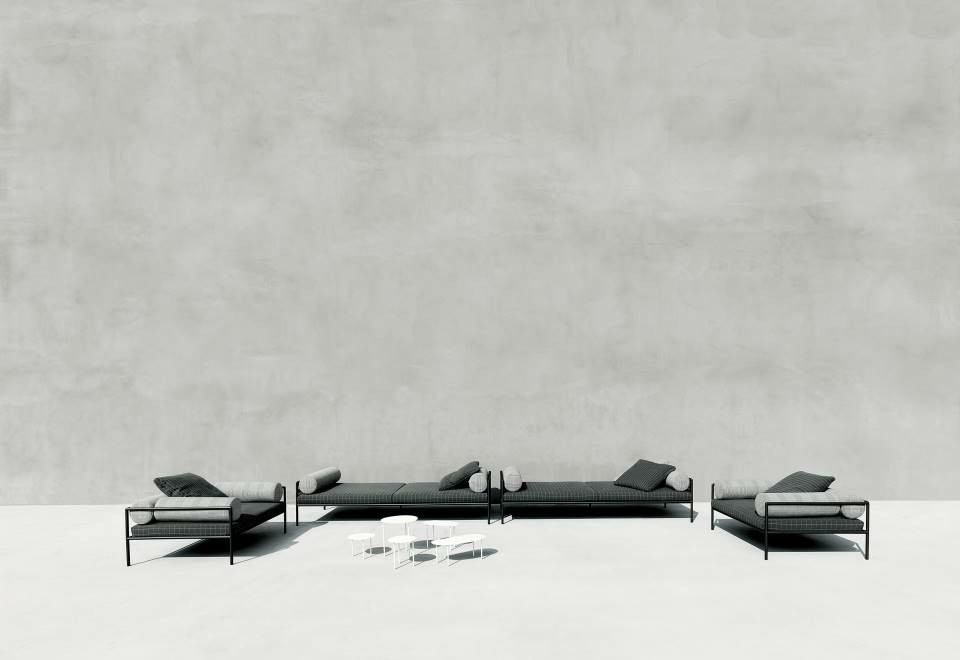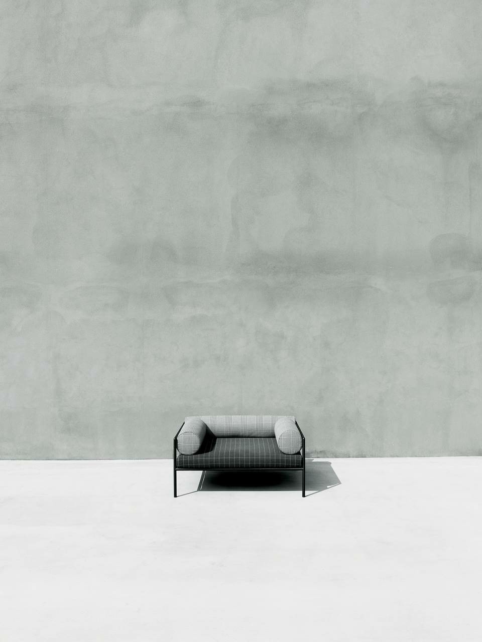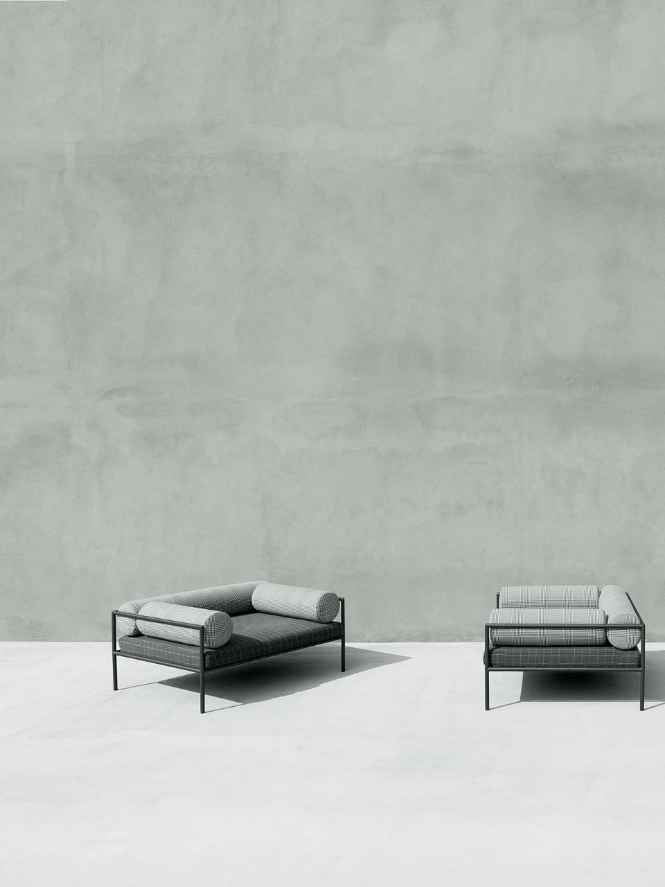 Armchair, sofas and day bed available for indoor and outdoor, both in the “Light” version - structure only - or with weaving in the materials available in the collection. Indoor version: tubular steel frame ?25mm with epoxy powder coating gunmetal color, woven with full background motif, warp and weft, in cellulose cord. Seat chassis in tubular steel, section 40x30mm, with epoxy powder coating, screwed to the structure, sprung with coated rubber elastic straps with padding in polyurethane foam covered in 100% polyether thermally bonded onto a polyamide velveteen backing. Seat cushions, in different density polyurethane foam, and bolster cushions for backrests and armrests, in polyurethane foam, covered with acrylic fiber layers. Leather or fabric upholstery. Outdoor version: tubular frame ?25mm in Stainless Steel AISI 316 with matt satin finish or with a galvanizing base for outdoor with epoxy polyester powder coating gunmetal color, woven in waxed rope (? 5mm) in the finishing available in the collection. Seat chassis, screwed to the frame, in 40x30mm Stainless Steel, sprung with coated rubber elastic straps, with stainless steel hooks. Padding with open-cell structure polyurethane foam DRYFEEL S and fibre for outdoor, coated with heat- sealed waterproof fabric protection. Seat cushions and bolster backrests and armrests cushions, padded with open cell structure polyurethane foam DRYFEEL S and fibre for outdoor, covered with heat- sealed waterproof fabric. Upholstery with outdoor fabrics only. For both versions, upholstery fully removable by zippers and Velcro fastenings. Floor support secured by black PVC feet