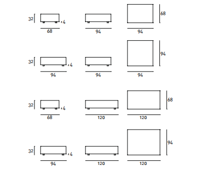 Modular elements of different dimensions, available for indoor and  outdoor. Indoor version: frame in double-paneled poplar and pine. Support in  cross-woven, coated rubber elastic straps. Padding in differentiated  density polyurethane foam. Covering in needle punched, resinated,  non-woven polyester fibre, bonded onto a polyamide velveteen  backing. Fabric or leather upholstery. The fabric version only is fully  removable by Velcro fastenings. All elements in leather have  perimeter seams, and the upholstery is non-removable. Outdoor version: frame in steel lacquered for outdoor for bases and in  steel lacquered for outdoor and plywood for outdoor for backrests and  armrests. For bases only, support in cross-woven, coated rubber  elastic straps and hooks in Stainless Steel for outdoor. Padding with open cell structure polyurethane foam DRYFEEL S,  coated with draining fabric for outdoor. Upholstery with outdoor fabrics only completely removable by Velcro  fastenings. Both versions with black adjustable PVC feet; the various elements are  joined together by means of hooks. Seat depth 68-94-120-134cm.