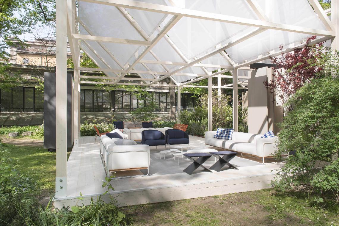 Armchair and sofa with frame in curved tubular ?22mm Stainless Steel AISI 316 with mat satin finish or with epoxy polyester powder coating RAL-K7 9010 white or RAL-K7 9017 black. Seat panel with slats in kiln-stabilized solid Iroko wood, 28mm thickness, treated with a highly UV protective oil. Seat, backrest and armrests cushions in open cell structure polyurethane foam DRYFEEL S, covered with fibre for outdoor and with a waterproof fabric. Upholstery with outdoor fabrics only, fully removable by zippers. Seat depth 56cm