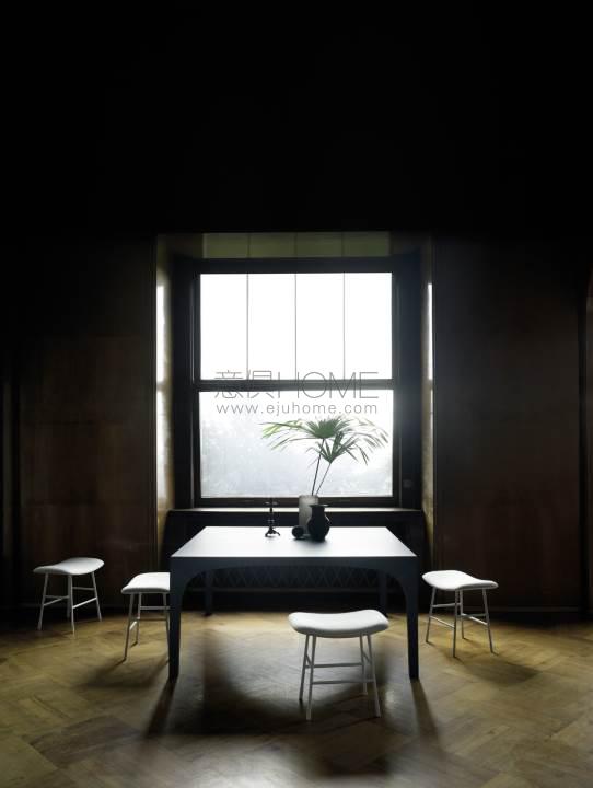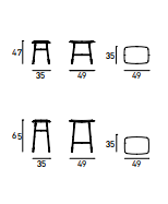 Stool with two different heights, 47cm and 65cm. Base structure in turned steel with epoxy powder coating in RAL-K7 9010 white and 9017 black, with adjustable tips. Curved plywood poplar seat frame. Polyurethane foam padding covered with polyester fibre. Fabric or leather upholstery, both fully removable by zippers.