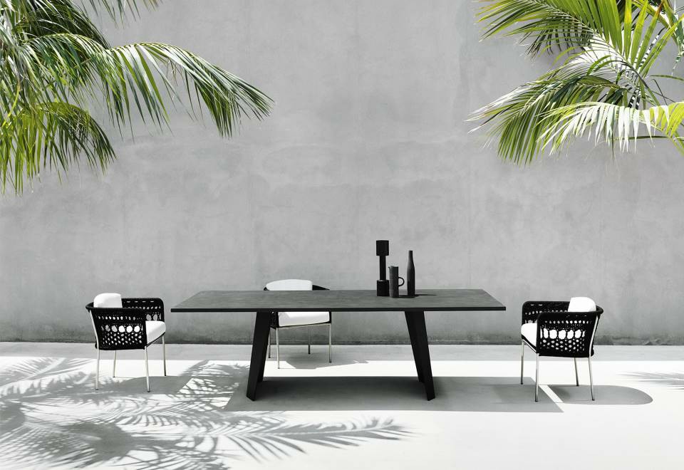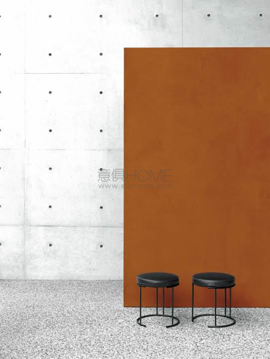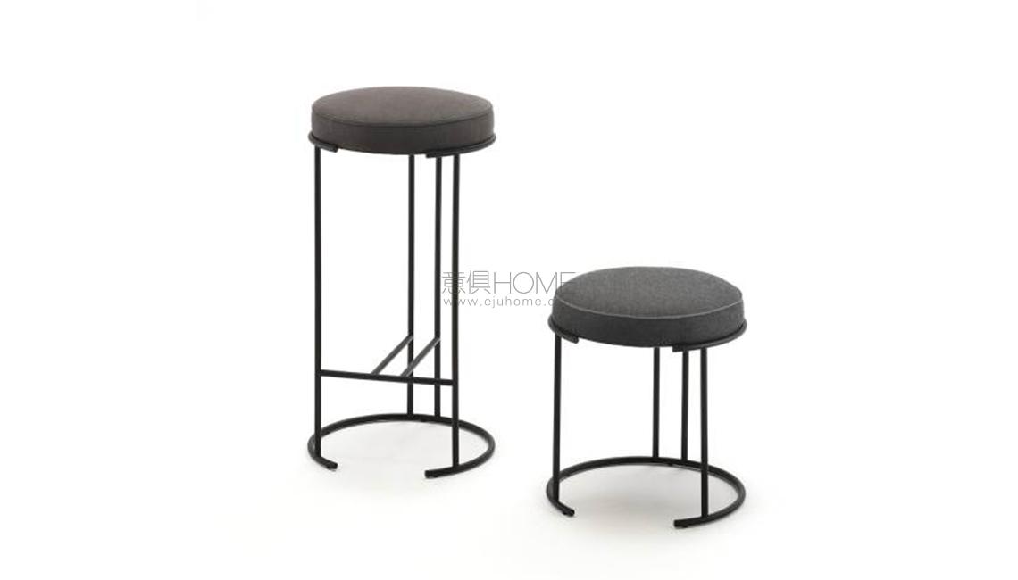 Stool available in two heights for indoor and outdoor. Indoor: supporting frame in steel rod section ?12mm coated with epoxy powder RAL- K7 9017 matt black. Seat panel in multilayer poplar wood and padding in polyurethane foam and acrylic fibre layers. Fabric or leather upholstery with grosgrain piping when in fabric, and when in leather piping in the same finish as the seat. Outdoor: supporting frame in steel rod section ?12mm coated with a galvanizing base for outdoor and epoxy polyester powder finish RAL- K7 9017 matt black. Seat panel in marine plywood and padding in open cell structure polyurethane foam DRYFEEL S covered with fibre for outdoor and with a heat-sealed waterproof fabric. Upholstery with outdoor fabrics only. For both versions fully removable upholstery by Velcro fastenings, unscrewing the chassis from the supporting frame, and ground support secured by plastic feet.