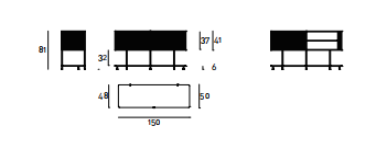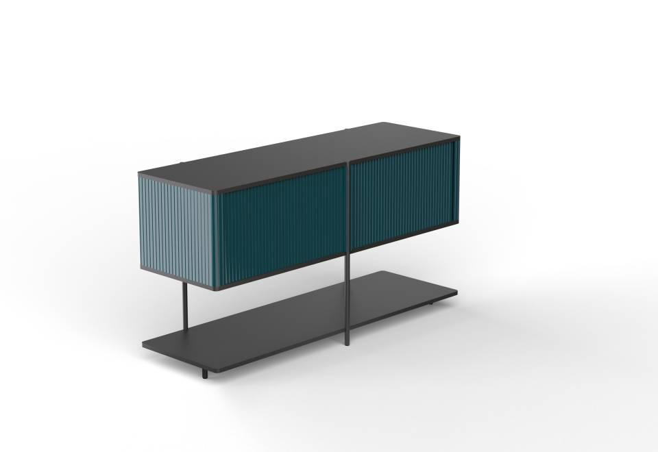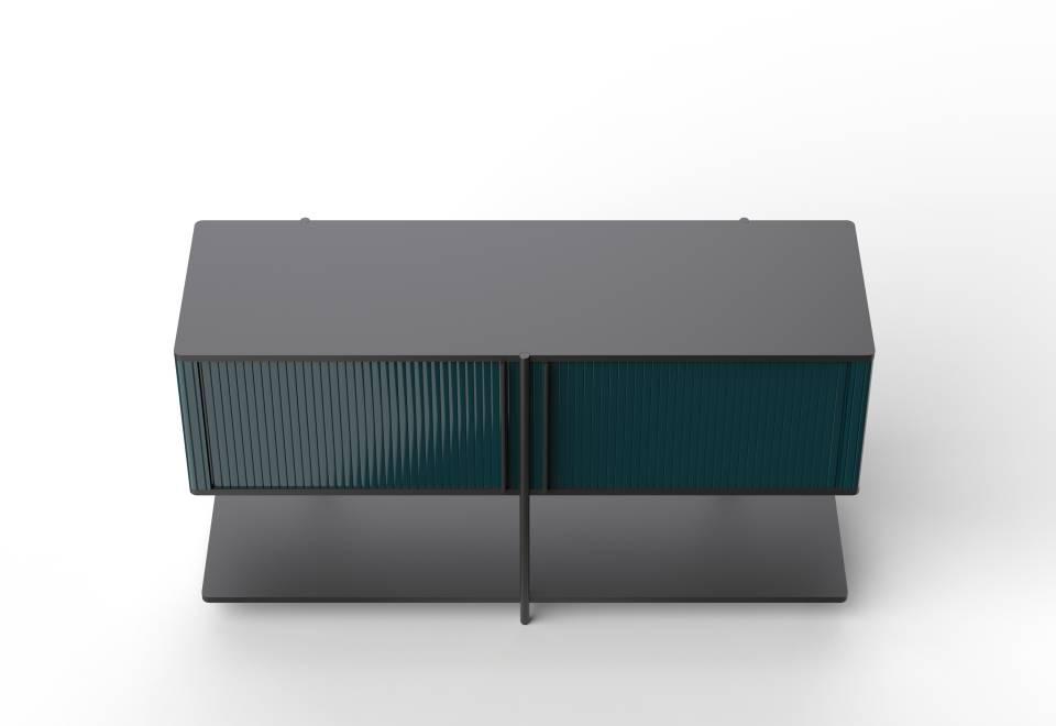 Bar unit composed of monoblock container consisting of top and bottom in 18 mm thick MDF fitted with a contoured runner to house a sliding shutter door made of extruded aluminium. Aluminum “blade -handles” section 10 x 8 mm thick, screwed to the shutter. Central body in contoured MDF milled on the outside, with internal side panels and central support shelf in MDF. Contoured lower shelf, in double- panelled wood, 18 mm thick, consisting of a 7 cm frame in solid beech wood and board honeycomb, enclosed by two aluminium plates, fitted with holes and bushings to allow assembly of the uprights. All MDF components are painted RAL-K7 9017 matt black. Shutter door with liquid painting RAL-K7 9017 matt black only. Uprights in steel rod ?22 mm, with inserted fixing element for the lower shelf. The frontal upright is provided with contoured plate for the fixing of the container compartment; while the other uprights are screwed to the backrest. Two additional steel rod supports, with integrated height adjustable PVC foot, are screwed to the lower shelf. Uprights, additional supports and feet are finished with epoxy powder coating in RAL-K7 9017 black. Available with internal spotlight equipped with motion sensor and rechargeable lithium battery. Charging with induction system and Micro USB cable. Available with 3000K light.