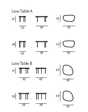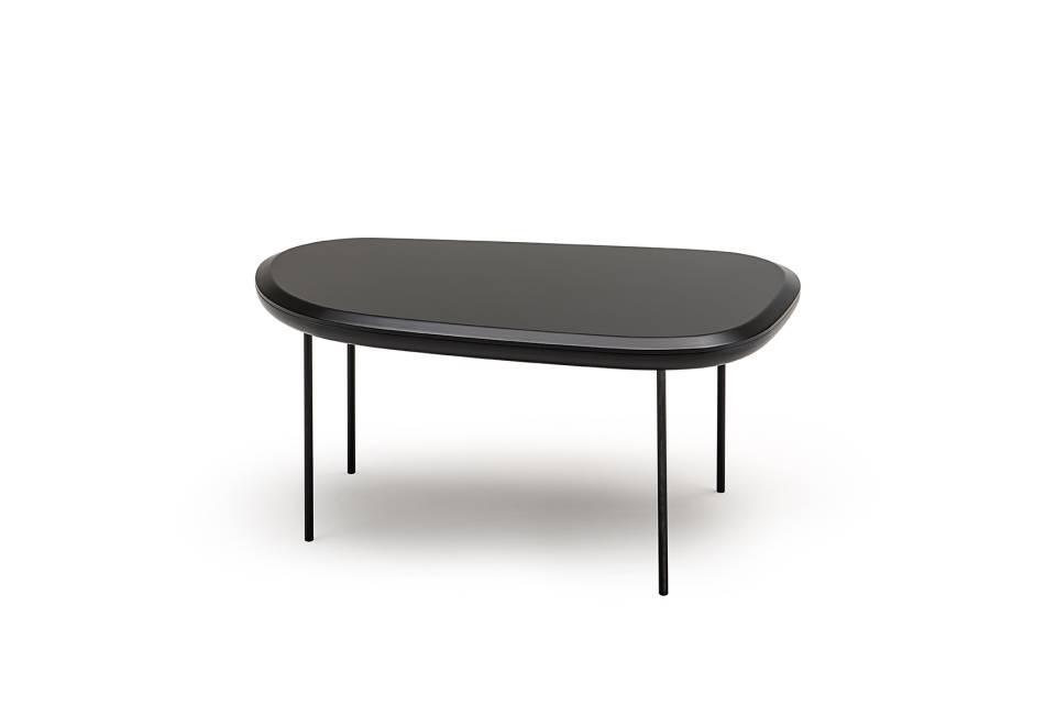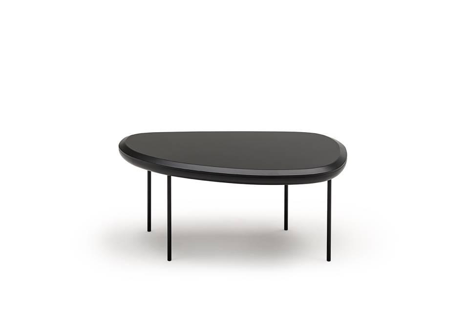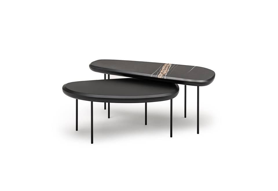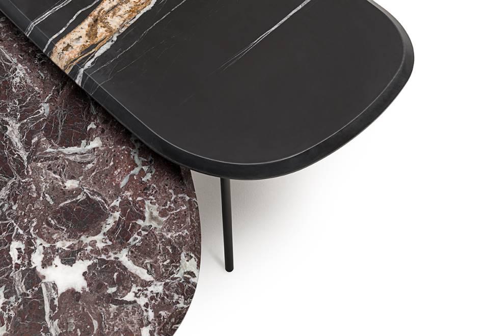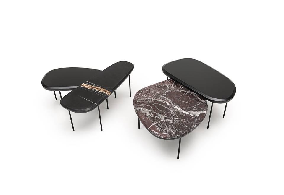 Family of small tables with organic shapes, with monobloc top composed of a bevelled top available in MDF lacquered matt black or in marble, screwed to the lower edge of the top in MDF always lacquered matt black, fitted with fixing bushes to screw the tubular steel feet ?12 mm lacquered with epoxy powder coating gunmetal grey colour. Floor support secured by black PVC feet. Tops in marble, available in white Carrara, red Levanto, black Marquinia and Sahara Noir, with a satin finish and a matt transparent protective varnish or with matt or glossy polyester finish.