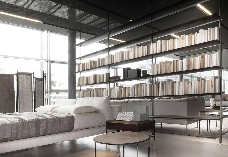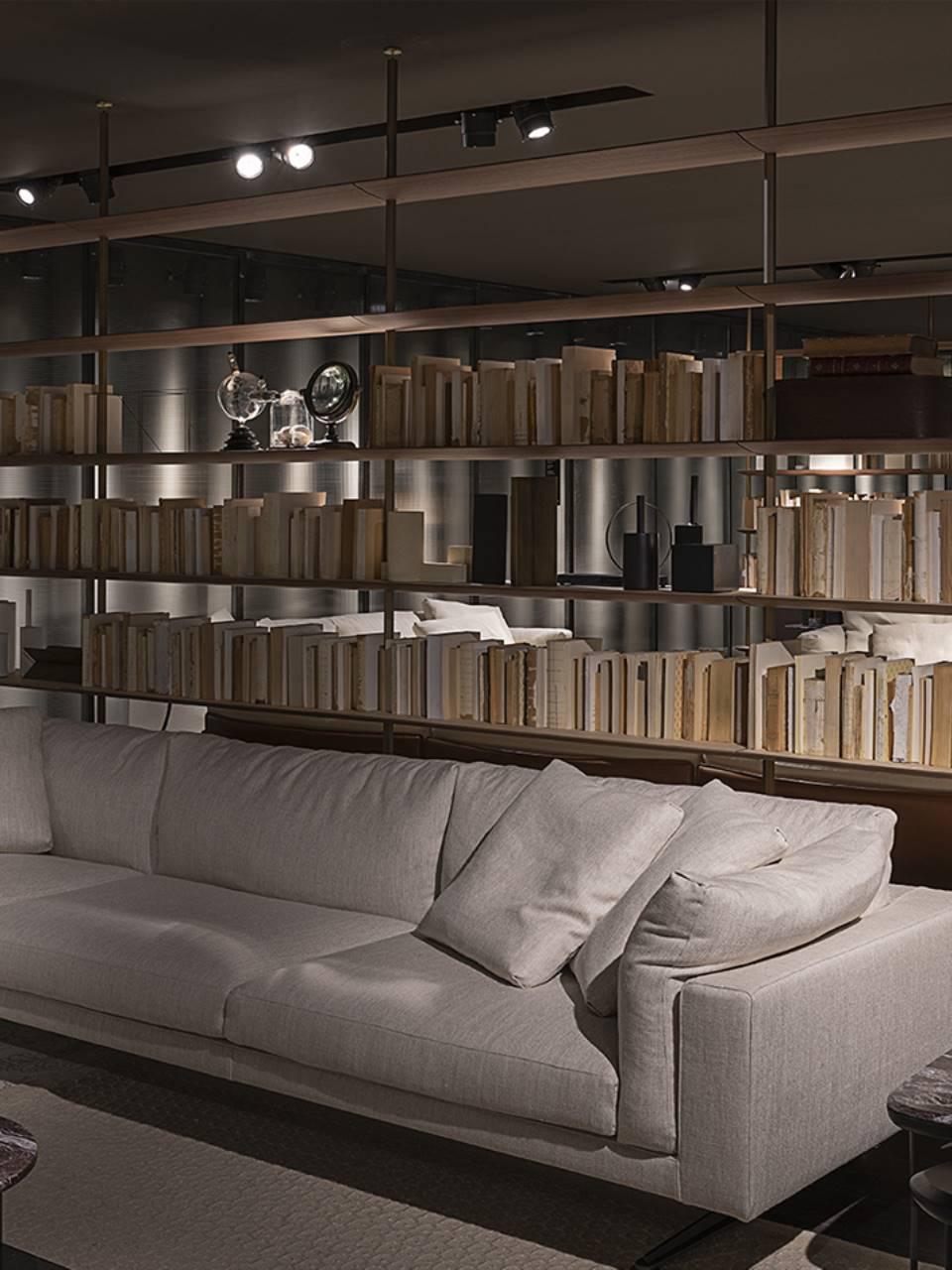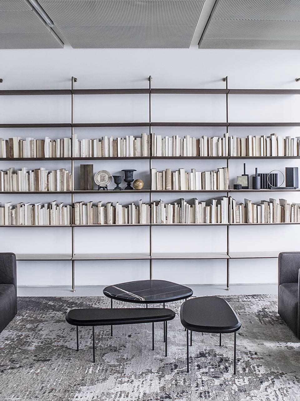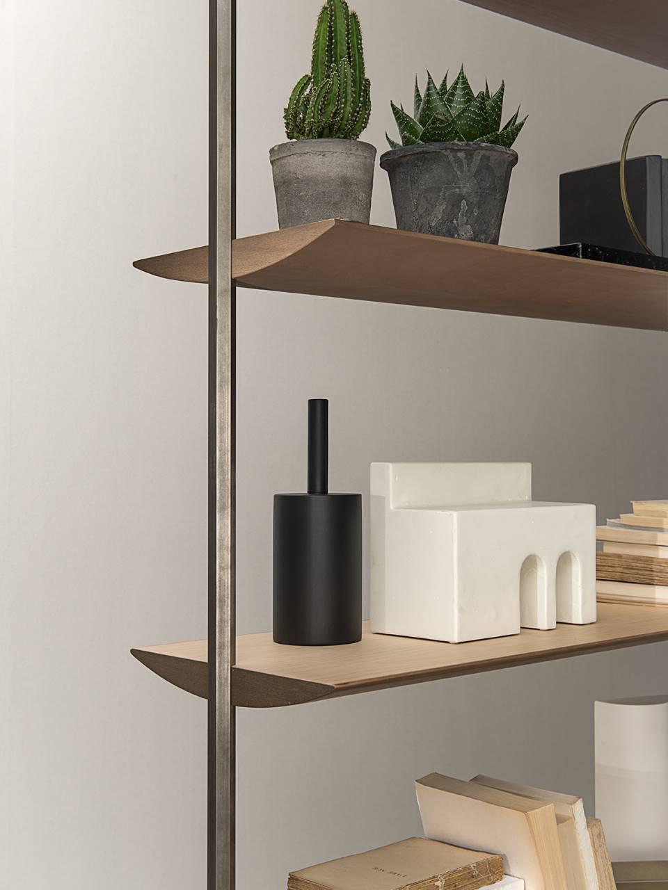 Bookcase inspired by the world of boating, which allows maximum freedom for floor-to-ceiling or wall mounted compositions. Steel uprights with hexagonal section 25 mm, fitted with holes having a center to center distance of 38,5cm (35cm of useful space) to install the shelves, and an additional wall fixing spacer, for greater structural rigidity (for the both versions). Uprights finishes: matt transparent liquid painted steel or brass coloured steel with matt transparent finish. Floor-to-ceiling support plates with joint, ?50 mm in satinized brass with a transparent matt varnish, screwed to the uprights. Floor, ceiling and wall support secured by black PVC elements. Maximum height of uprights: floor-to-ceiling version 305 cm; wallmounted version 250 cm with plate fitted for wall mounting (with a fisher) and wall support guaranteed by black PVC rounds. “Keel shaped” shelves (75/90/120/150 cm depth 33 cm) made of extruded aluminum bar, with glued an upper top in MDF (thickness 3mm) veneered in the finishings in collection and with terminal parts in solid wood, always in the same finishing of the “keel”, fitted with joints to allow the fixing to the uprights. Shelves available in the finishes: Stone Oak? veneered top with matt black painted “keel” part and terminal parts; top in bleached maple with “keel” and terminal parts in Canaletto walnut “rigatino”.