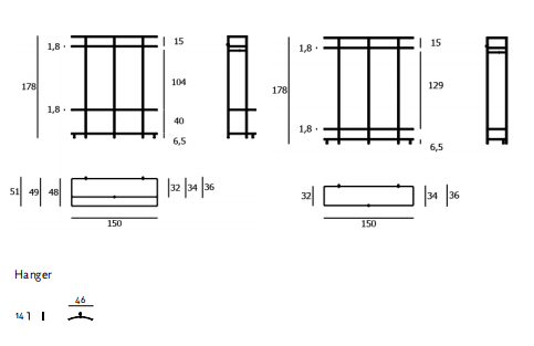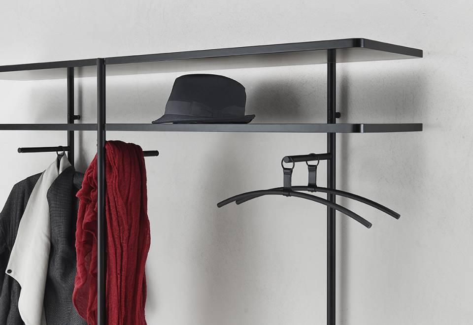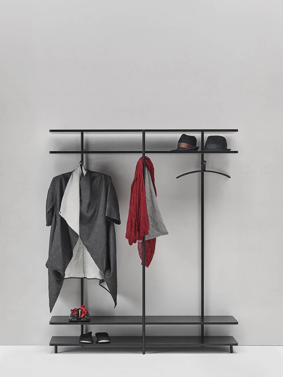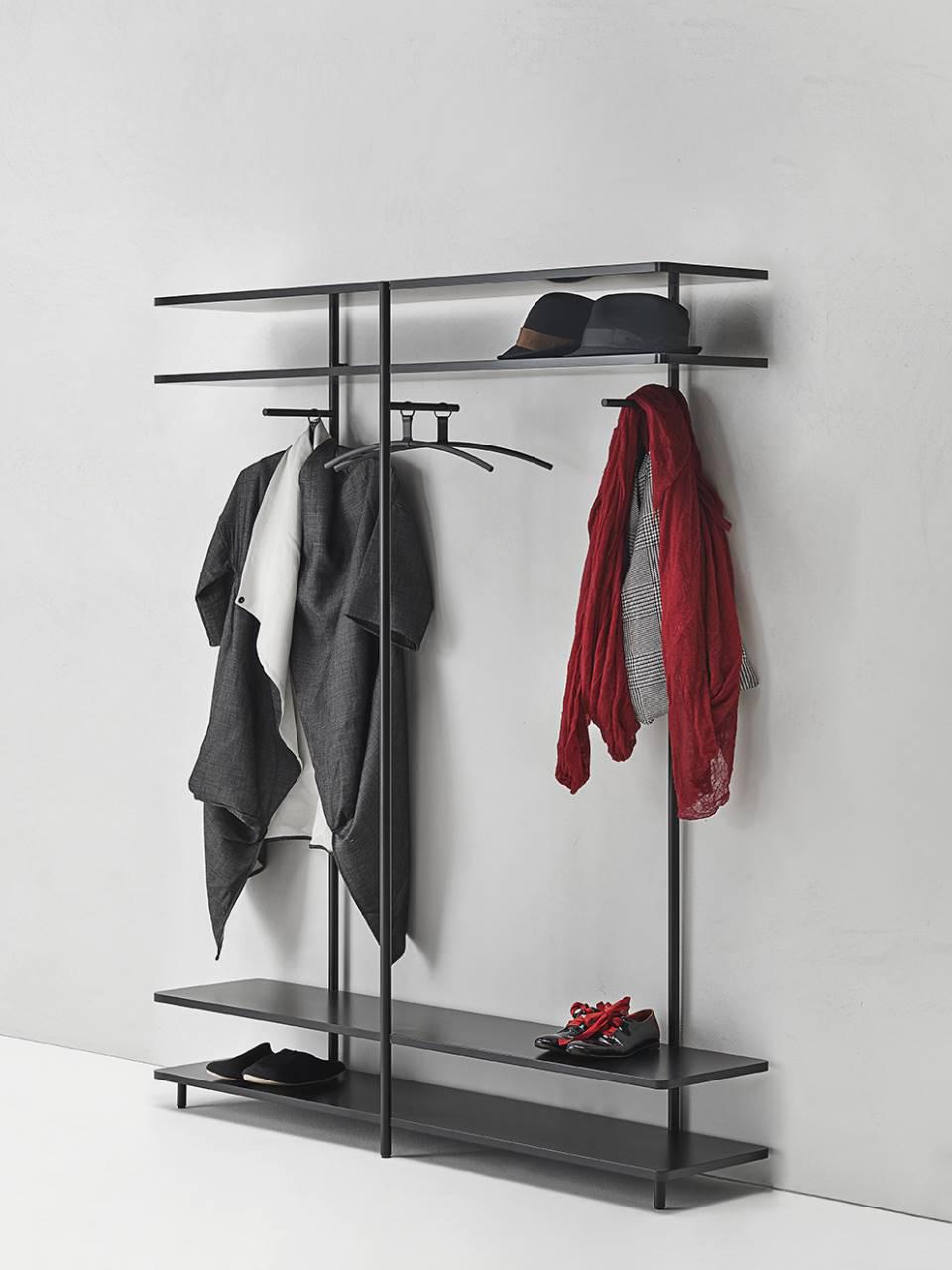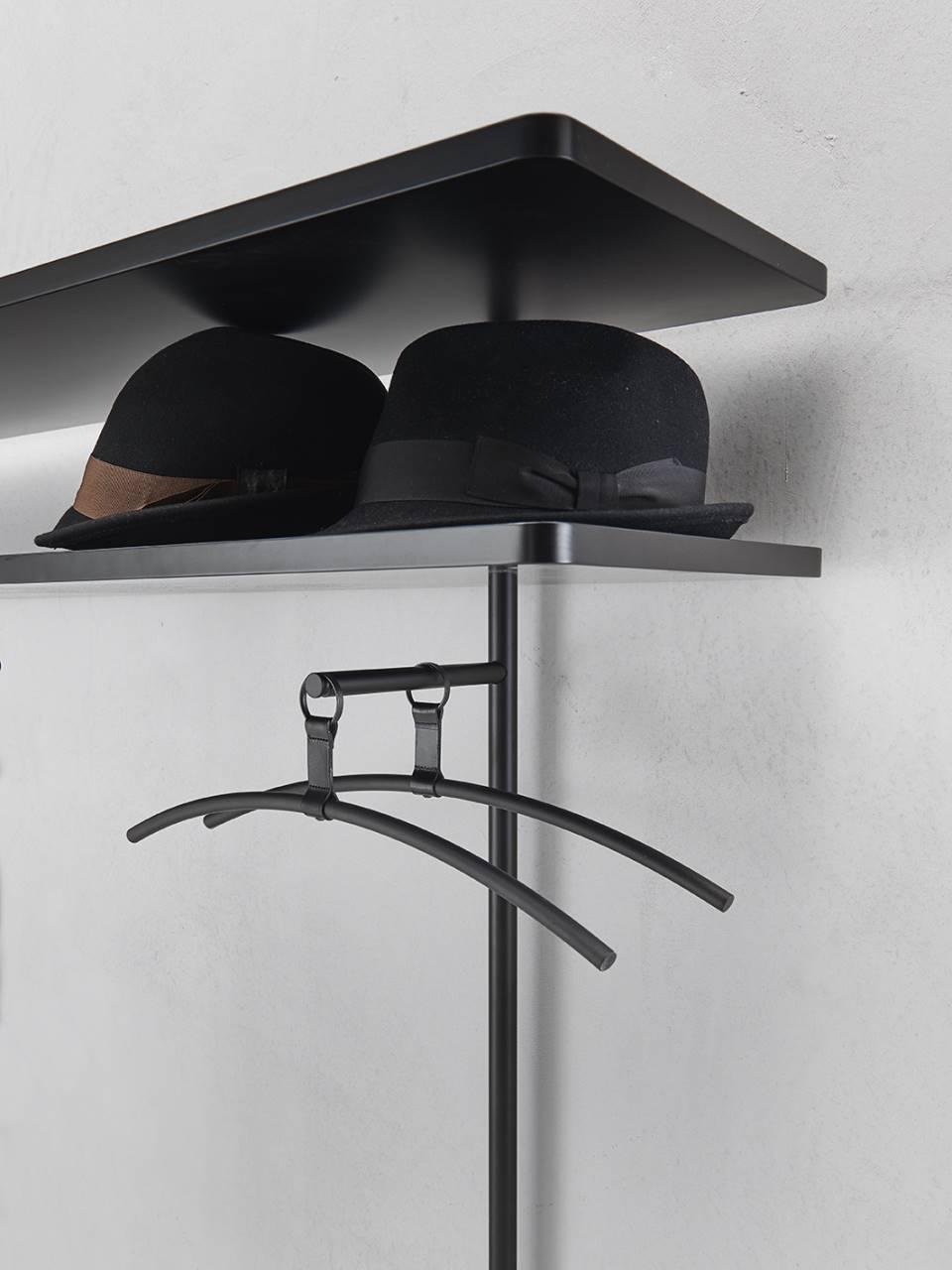 Valet stand “fixed on the wall”, available with lower shelves in two different depth (32 cm or 48 cm) and available with shelves in two different finishings: Liquid painting version coloured RAL-K7 9010 white or RAL-K7 9017 black, or “cement effect” available in the Chiaro and Scuro variant. Contoured doublepaneled shelves (depth 32cm) thickness 18 mm, constituted of a 7 cm frame in solid beech wood and board honeycomb, enclosed by two aluminium plates. Whilst lower shelves depth 48cm, in “sandwich” of MDF and aluminum sheet. All shelves versions, fitted with holes and bushings to allow the fixing of the posts. “Laminate” version with upper and lower (in both depths) shelves in “sandwich” of MDF and aluminum sheet, enclosed in two sheets of laminate with embossed finish and perimetral edges in black thermoplastic material. Shelves fitted with holes and bushings to allow the fixing of the posts. For both versions, steel uprights ?22 mm, with inserted fixing element and integrated height-adjustable PVC feet, finish with epoxy powder coating in RALK7 9010 white, RAL-K7 9017 black or gunmetal grey color. The structure is fitted with 2 supplementary steel supports with integrated heightadjustable PVC feet, secured to the bottom shelf. Wall fixing element, composed of a couple of “male-female” thread pivots (that allow a depth adjustment of the valet stand), anchored to the external posts through screws. Hanger supports in steel rod ?16 mm, fixed to the uprights and painted in the their same finishing. Hangers consisting of a ?12 mm calendered steel rod and ?35 mm steel ring lacquered with epoxy powder coating black or gunmetal grey colour, connected together by a “band” of sewn black leather.