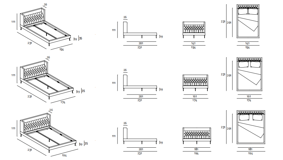 Double bed with headboard structure in multilayer poplar and double-paneled fir-wood; padding in polyurethane foam and acrylic fiber layers, covered in 100% polyether thermally bonded onto a polyamide velveteen backing. Headrest, inset in the headboard structure, in multilayer padded in differentiated density polyurethane foam with “capitonné” detail and non-removable leather or fabric upholstery. Bedstead chassis, in 70x20mm tubular steel with black epoxy powder coating, made of two separate parts connected by plates and secured with screws. Bedstead structure, screwed on the chassis, in multilayer padded in polyurethane foam and covered in 100% polyether thermally bonded onto a polyamide velveteen backing. Feet, inset in specific bushing welded to the chassis then secured with screws, in drawn-steel square section 15x15mm with bronzed epoxy powder coating and adjustable black PVC tips. Headboard and bedstead structure with fabric or leather upholstery, both fully removable by Velcro fastening. All perimeter stitching are enhanced with edgings in Grosgrain for the fabric version, and braided leather trim, always in the same finish, for the leather one. Fabric cover to protect the slat base, in 100% cotton col. Ecru, fixed to the slat frame with Velcro fastening. Also available in American standard Queen and King size.