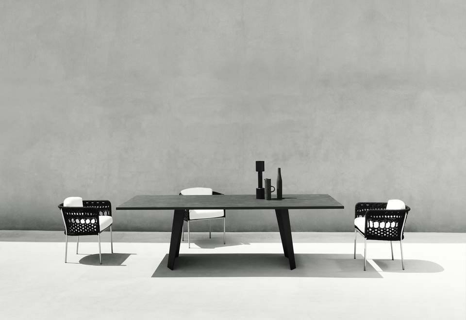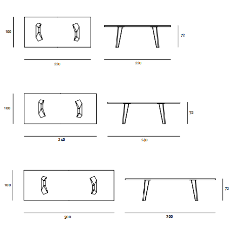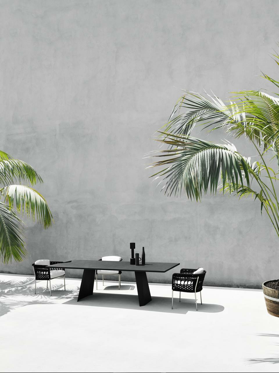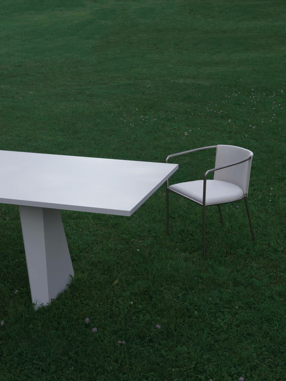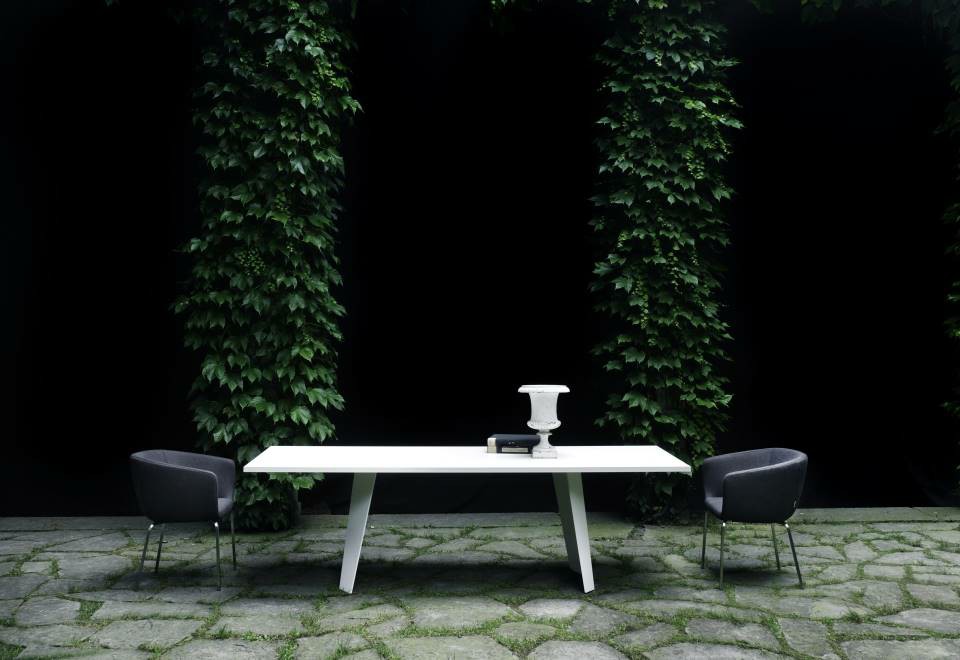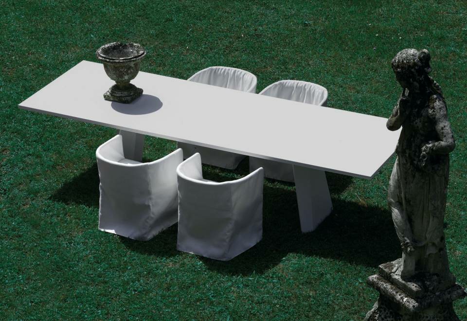 Rectangular table, available in two versions, chestnut wood or aluminium. Wooden version for indoor with leg in 1mm chestnut plate with inner solid wood internal structure. Top in 1mm chestnut plate on poplar plywood structure with inner tubular steel support. Acrylic paint fi nish, natural chestnut or charcoal stained. Aluminium version for indoor/outdoor with leg in DOLUFLEX 4mm panel fi nished with IRONX technology. Top made with DOLUFLEX 28mm panels fi nished with folding edge. Finished with aluminium and polyurethane lacquer for outdoor, in the colours of our collection.