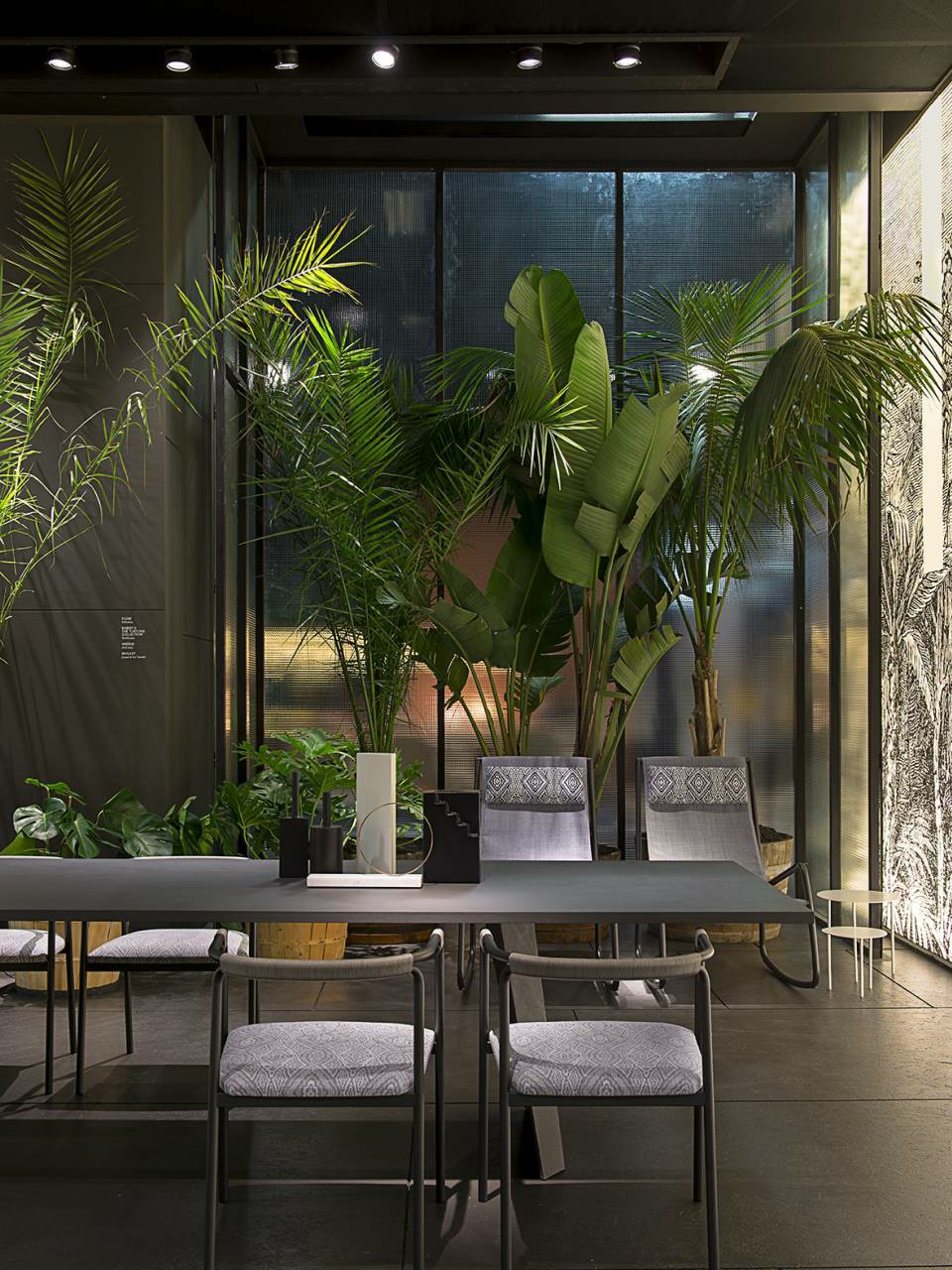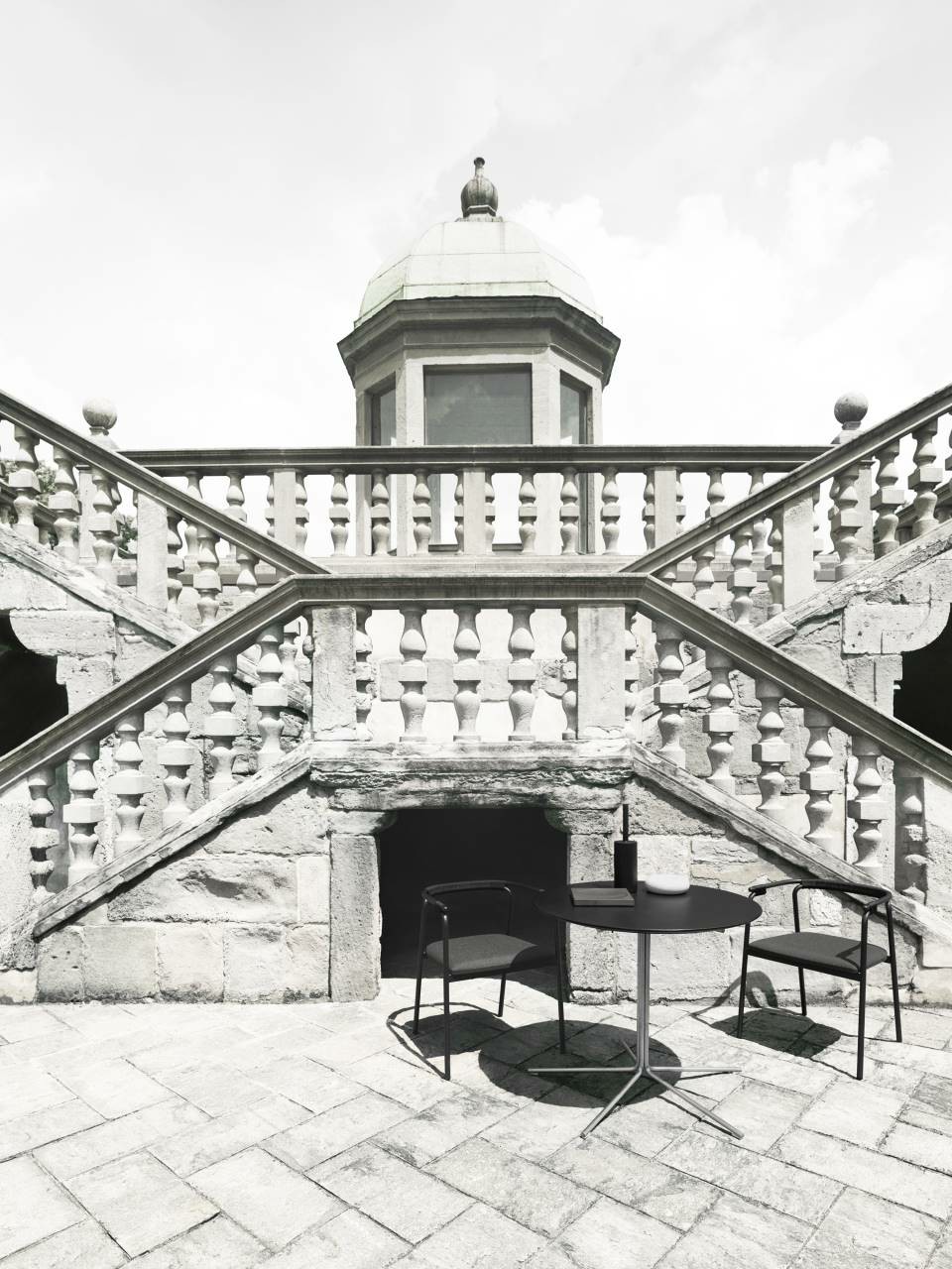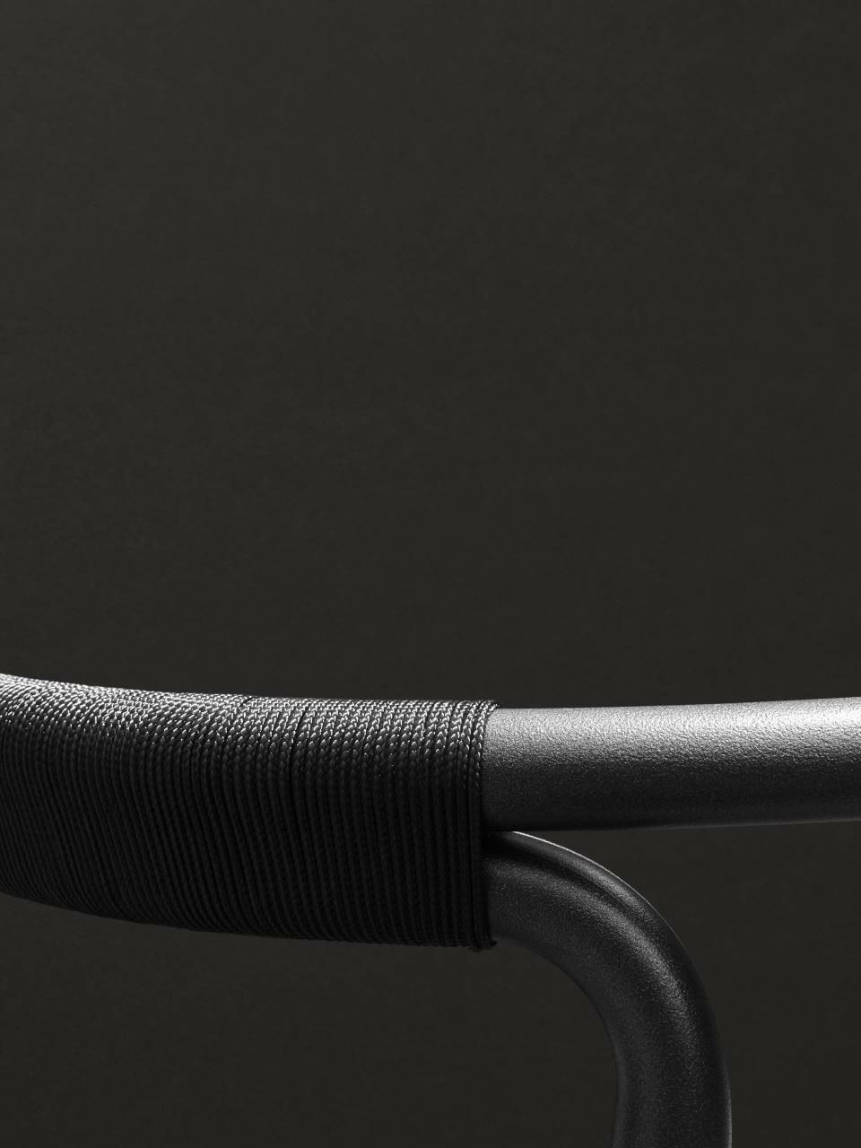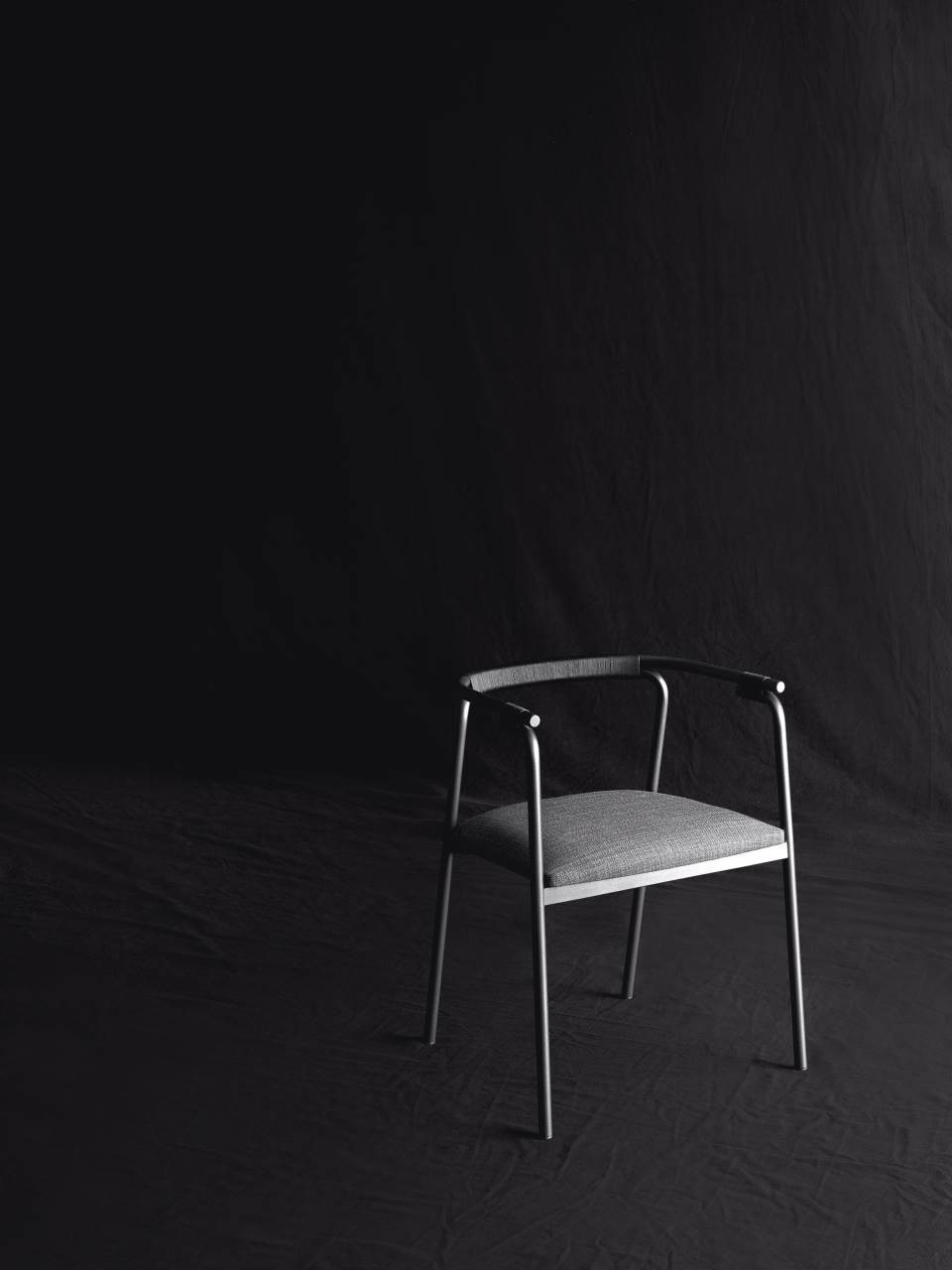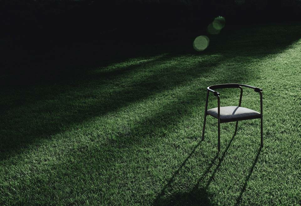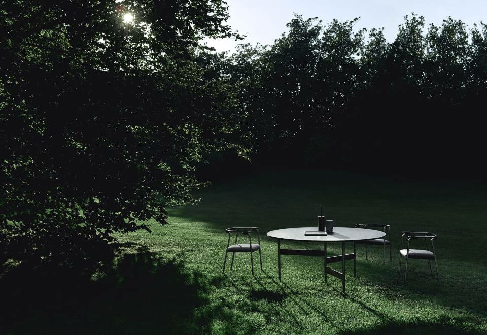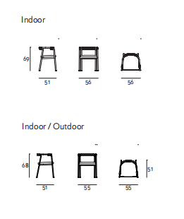 Chair available for indoor and outdoor. Indoor version: in solid ash wood ?30 mm with acrylic painting finish natural colour and with acrylic water-based finish, or charcoal-dyed, with acrylic base and acrylic painting finish. Seat chassis in multilayer sprung with coated rubber elastic straps, padded in polyurethane foam covered with acrylic fibre layers. Indoor/Outdoor version: with tubular frame ?22 mm in stainless steel AISI 316 lacquered with epoxy powder coating gunmetal grey colour; seat chassis in plywood for outdoor use, sprung with coated rubber elastic straps, padded in open cell structure polyurethane foam DRYFEEL S covered with fibres for outdoor and with a heat-sealed waterproof fabric cover. Decorative weave for backrest and armrests with profile in hide cellulose cord or waxed rope for outdoor use, in the colours of collection. Non-removable seat upholstery in fabric or leather; for the outdoor version, in outdoor fabrics only. Floor support secured by black PVC feet.