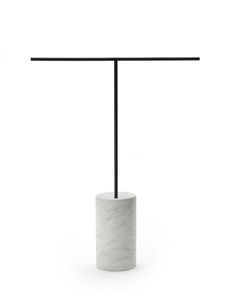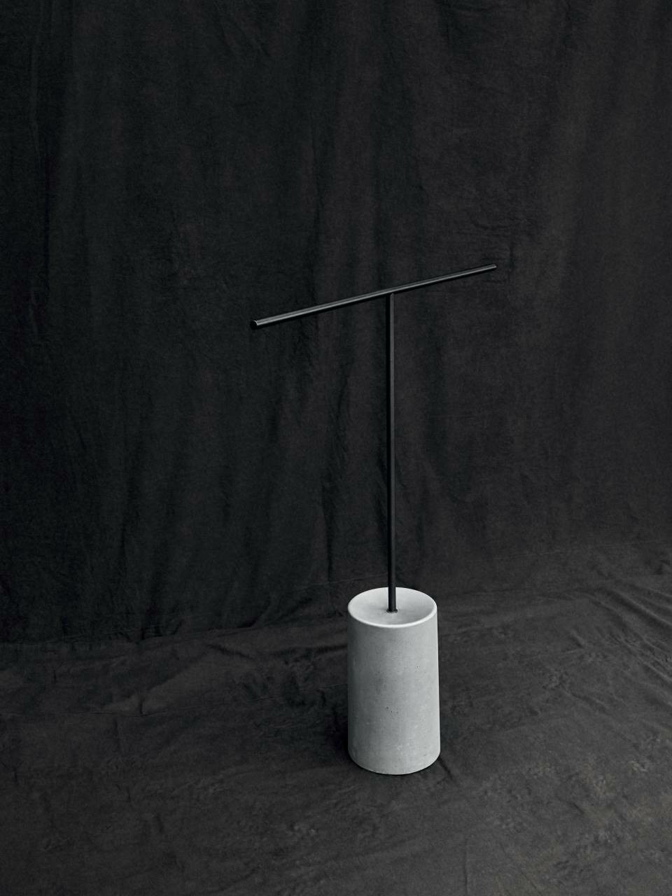 Coat-hanger, available in two heights, composed of a base carved from a single block of black Marquina, white Carrara, red Levanto marble with satin finish and opaque transparent protective varnish; or in high-strength concrete finished with a hydro-repellent protective treatment, with embedded a steel insert. On request, the marble base is available also with polyester glossy finish. Frame composed of two tubular steel ?20 mm elements, joined together by means of screw, lacquered with epoxy powder coating gunmetal grey colour, fixed to the base by a pierced sheet. Hangers consisting of a ?12 mm calendered steel rod and ?35 mm steel ring lacquered with epoxy powder coating gunmetal grey colour, connected together by a “band” of sewn black leather.