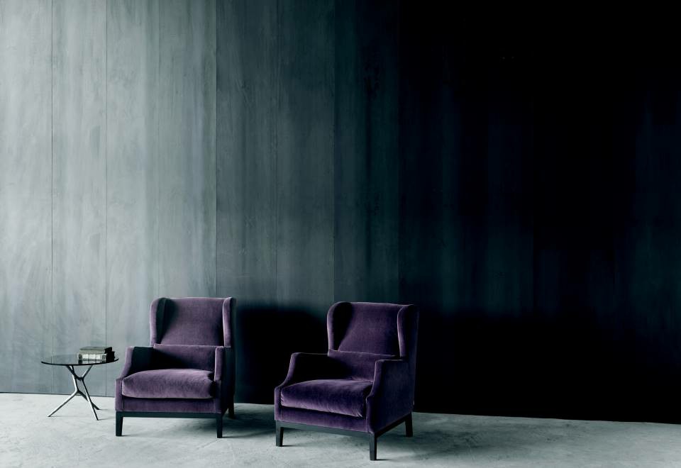 Bergère armchair with frame in poplar and pine plywood. Support in cross-woven, coated rubber elastic straps. Frame padding in differentiated density polyurethane foam. Covering in needle punched, resinated, non-woven polyester fibre, bonded onto a polyamide velveteen backing. Seat cushion in prewashed and sterilized goose down, stitched into separate compartments with insert in polyurethane foam. Base in solid oak wood with acrylic painting, natural polished or charcoal dyed. Fabric or leather upholstery. The fabric version only is also available with flounce 12cm from the floor and is fully removable by zippers and Velcro fastenings. The leather version is always without flounce and non-removable upholstery. Seat depth 60cm.
