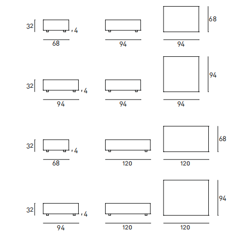 Modular elements of different dimensions, available for indoor and outdoor. Indoor version: frame in double-paneled poplar and pine. Support in cross-woven, coated rubber elastic straps. Padding in differentiated density polyurethane foam. Covering in needle punched, resinated, non-woven polyester fibre, bonded onto a polyamide velveteen backing. Fabric or leather upholstery. The fabric version only is fully removable by Velcro fastenings. All elements in leather have perimeter seams, and the upholstery is non-removable. Outdoor version: frame in steel lacquered for outdoor for bases and in steel lacquered for outdoor and plywood for outdoor for backrests and armrests. For bases only, support in cross-woven, coated rubber elastic straps and hooks in Stainless Steel for outdoor. Padding with open cell structure polyurethane foam DRYFEEL S, coated with draining fabric for outdoor. Upholstery with outdoor fabrics only completely removable by Velcro fastenings. Both versions with black adjustable PVC feet; the various elements are joined together by means of hooks. Seat depth 68-94-120-134cm.