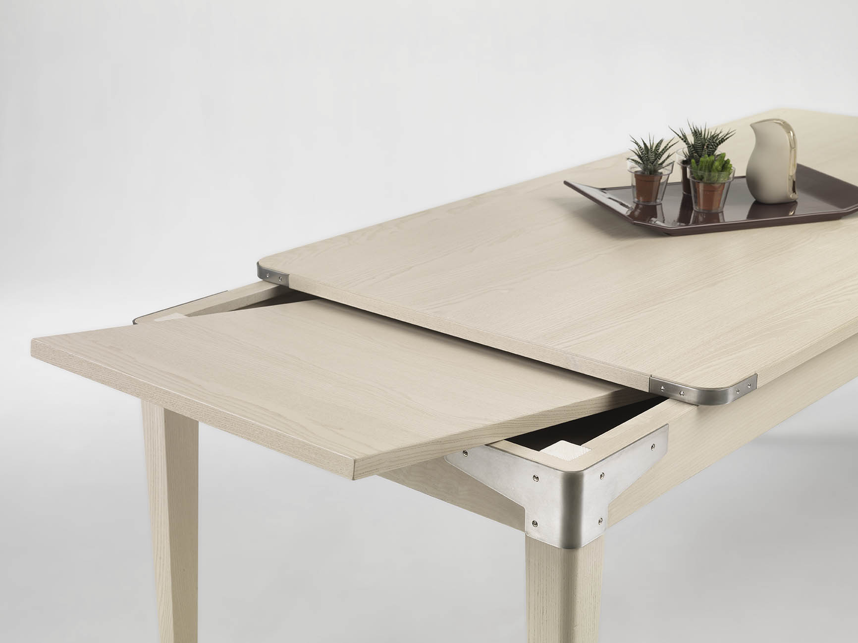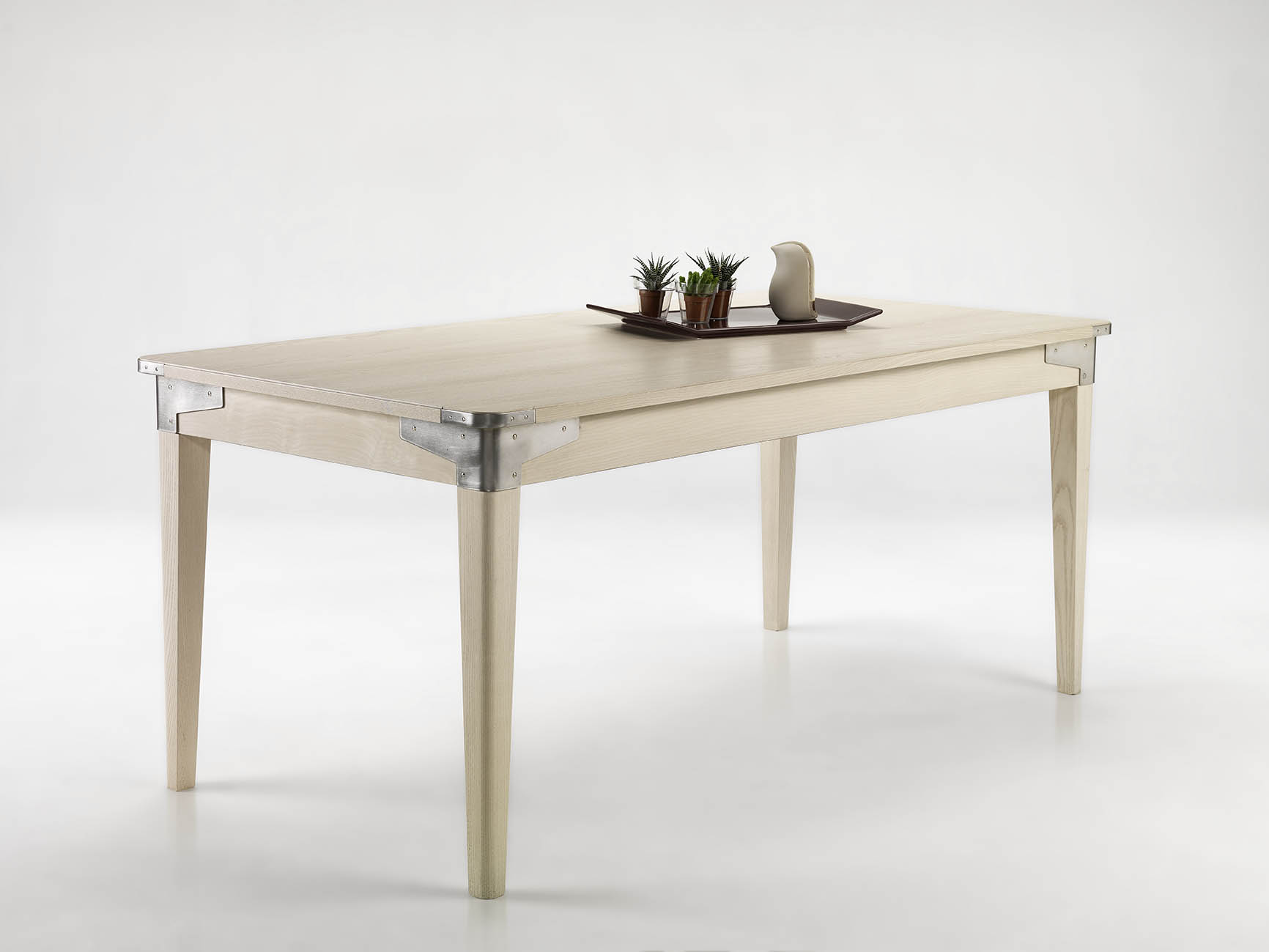 The Industrial rectangular table is distinguished by its linear and simple lines, highlighted by the steel corners recalling a post-industrial style. Handcrafted in ash wood, this table can also be extended thanks to a laterally sliding extension, which then rests on the side of the top.