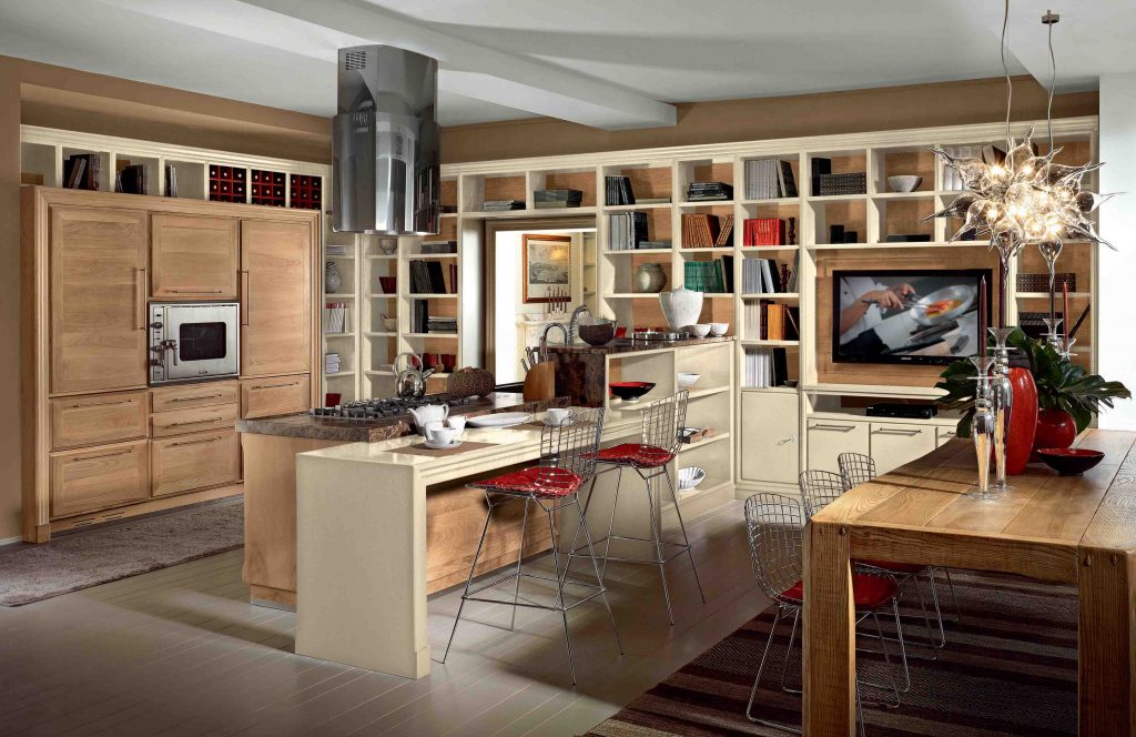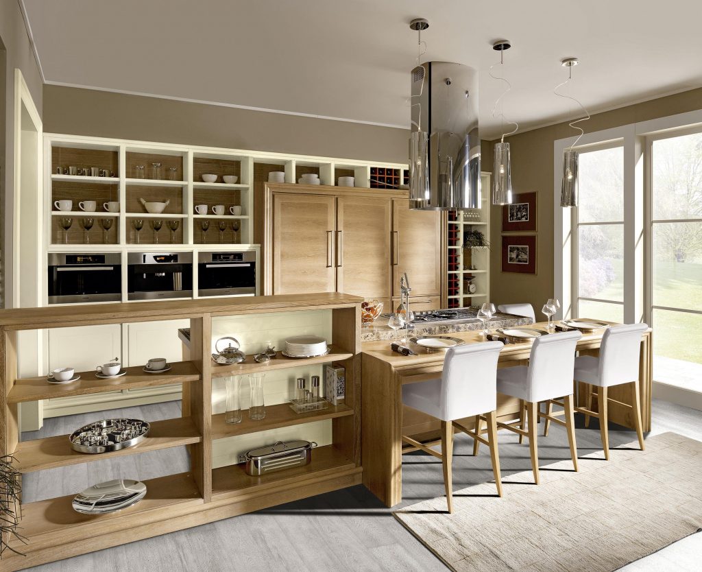 Solid wood, with its tenuous and natural veining, became the protagonist of the simple design of the Evita island or peninsula kitchen recalling fluid and open spaces.