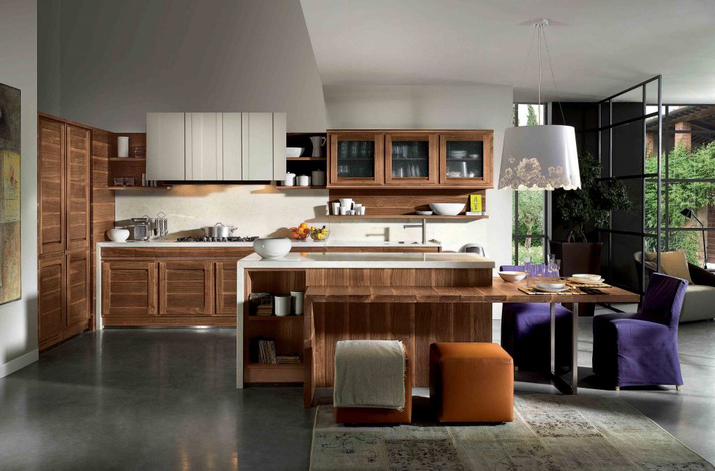 The integrated handles project, directly realized on the wood of drawers and doors, enhances the handicraft ability and highlights the wood of Canaletto kitchen.