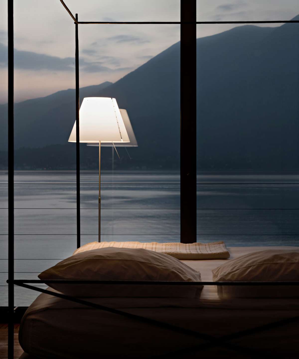 Elegant and light, this lamp emits a pleasant warm light through a silk-screened polycarbonate shade. The lamp’s height may be adjusted by means of a characteristic steel counterweight.