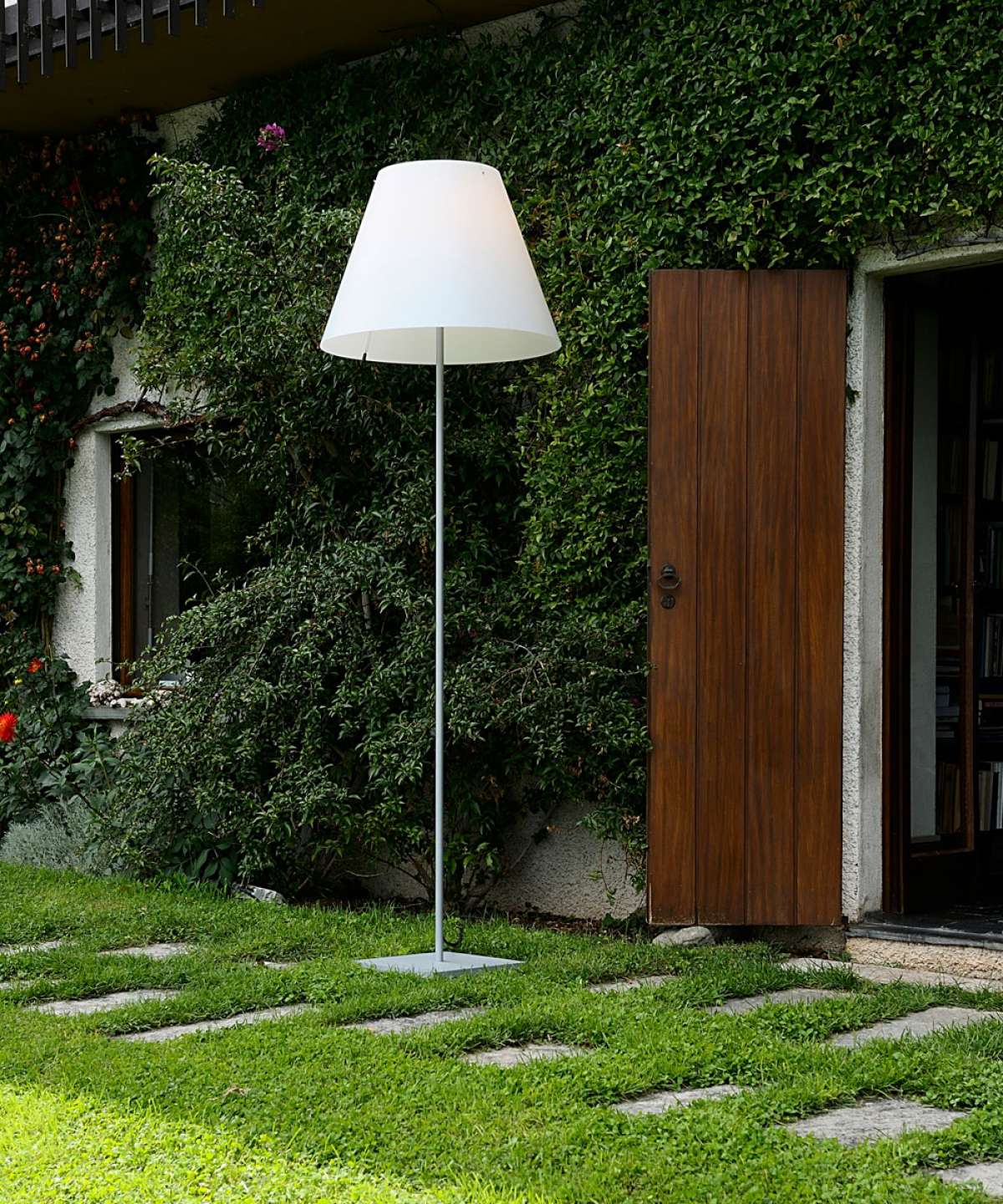 The outdoor version is perfect for terraces and gardens, to light spaces with elegance and efficiency. The shade comes in the colors ivory, rust or green. Stem in white, rust or aluminium.