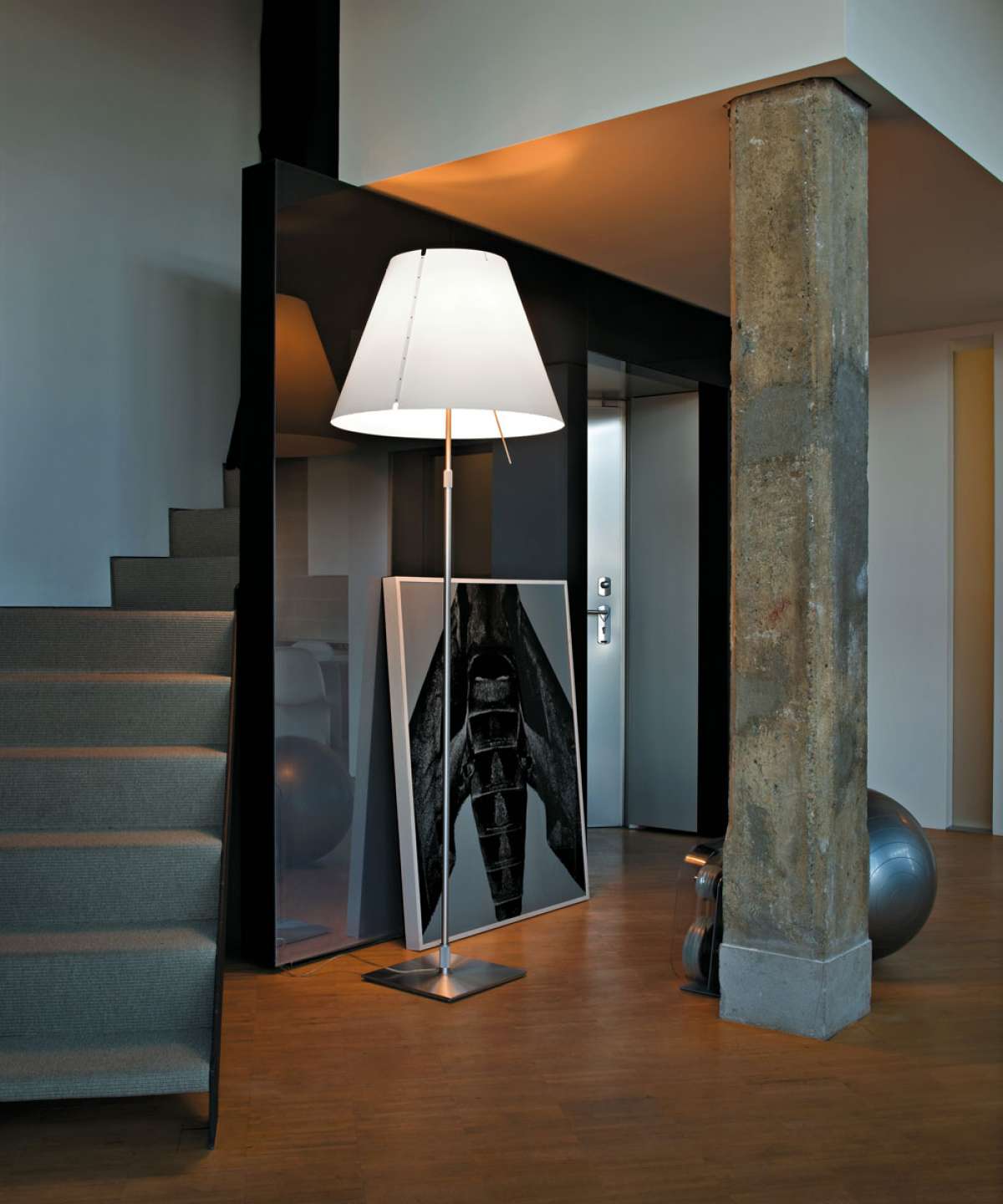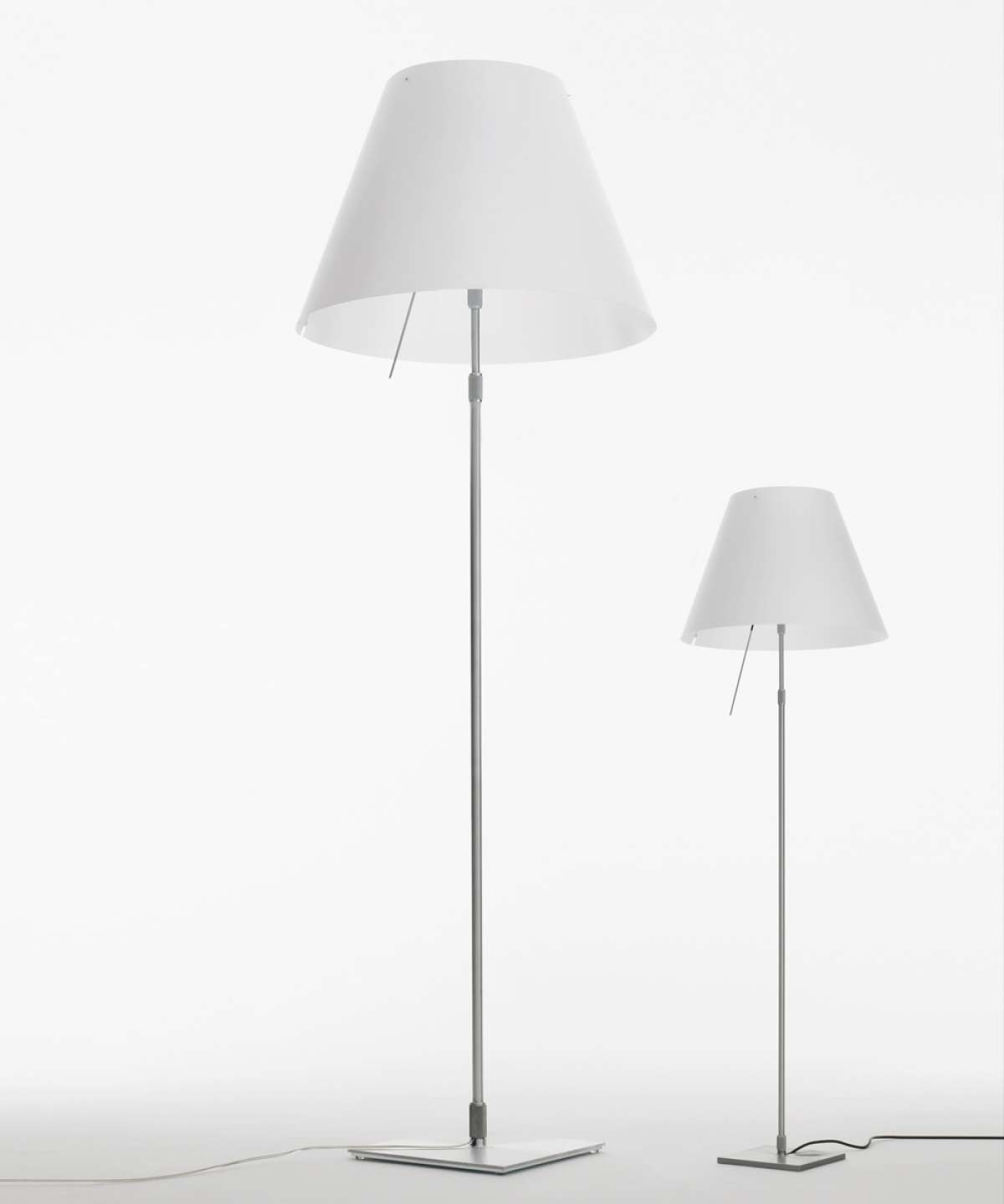 Tradition and innovation meet in this classic maxi floor model. The aluminium stem and polycarbonate lampshade enhance large spaces with lightness and luminosity for which this lamp is renowned. Also available in models with on/off or dimmer switch.