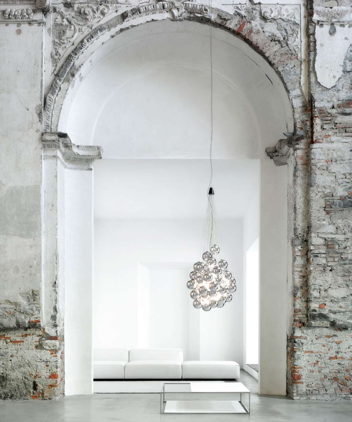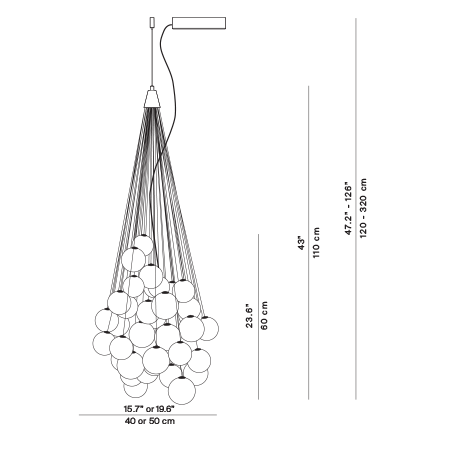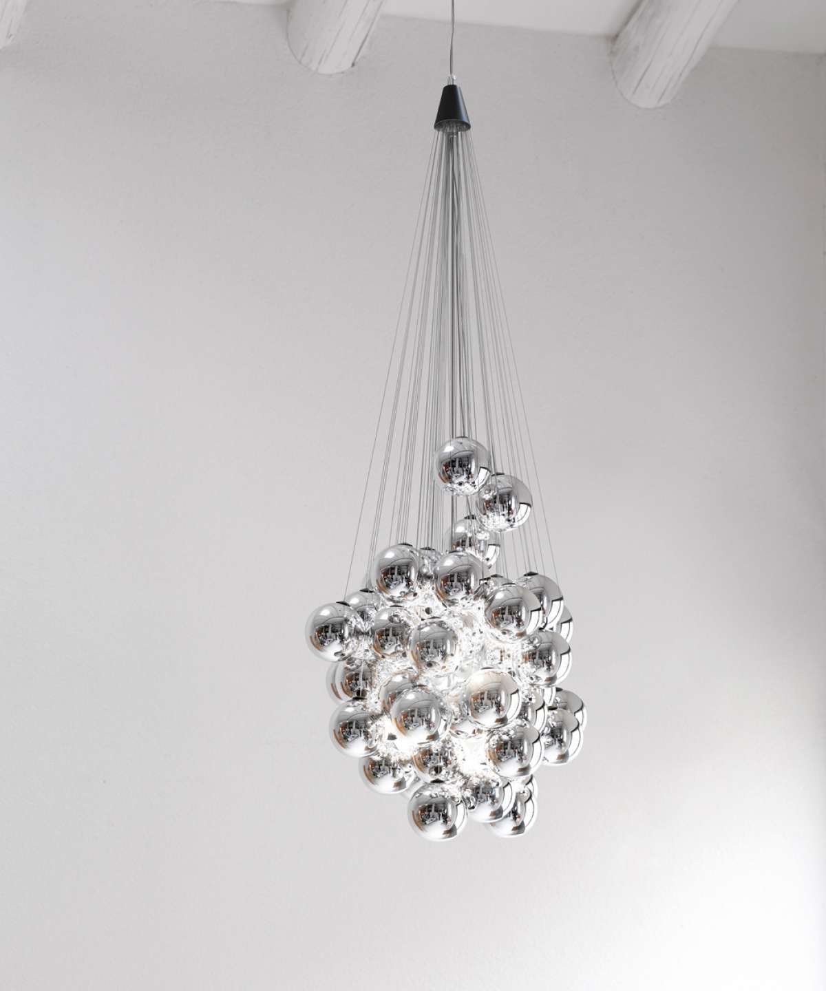 Composed of glass spheres at different heights, Stochastic takes on infinite combinations in a sort of controlled freedom: each sphere is connected to small steel rods of different lengths that can be attached to the structure according to your own creative impulses. The light source – a double high-efficiency LED module – is enclosed in the spheres, generating warm indirect light aimed upward and downward.