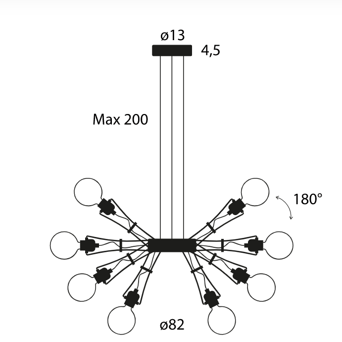 a pendant lamp whose huge expressive impact lies in the original composition of its eight thin steel arms. Tracing the shape of a star, they look like a mechanical octopus with E27 lightbulb fittings on the ends of its ‘tentacles’. In this way, light is emitted in all directions.
