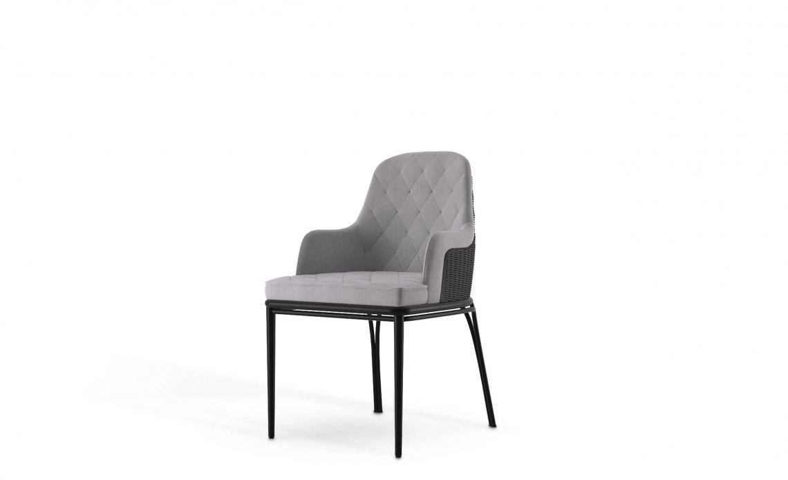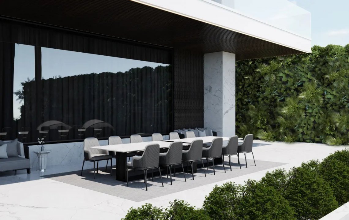 Our Outdoor Charla dining chair is a splendid object of boundless elegance. This marvelous design is the perfect example of timeless lines with a modern twist, made with a complexity of luxurious and resistant materials, such as Stainless Steal, Powder Coating and Synthetic Rope Mesh, perfect for a relaxed yet luxurious outdoor.