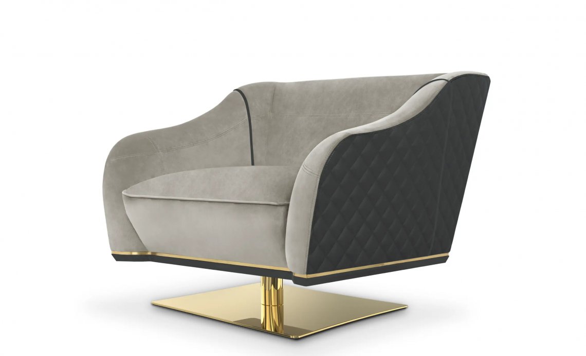 Inspired by the 1940s movie scene, this design is a lighter take on its family’s darker design. Crafted with the highest quality materials such as leather and velvet, this luxurious swivel single sofa provides the utmost comfort and accessibility with its rotating feature and will perfectly adapt to different ambiances and styles, becoming a focal feature in any space.