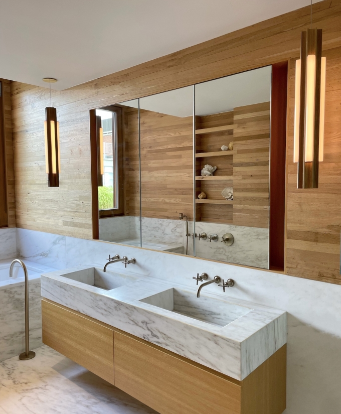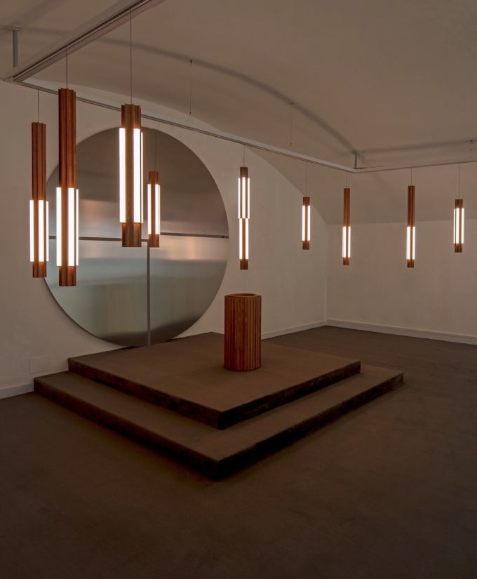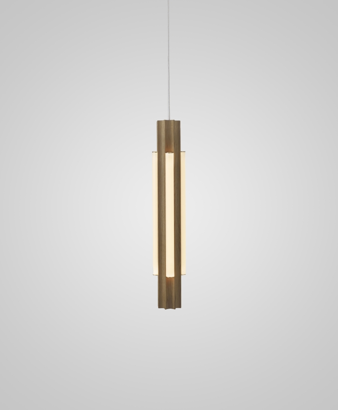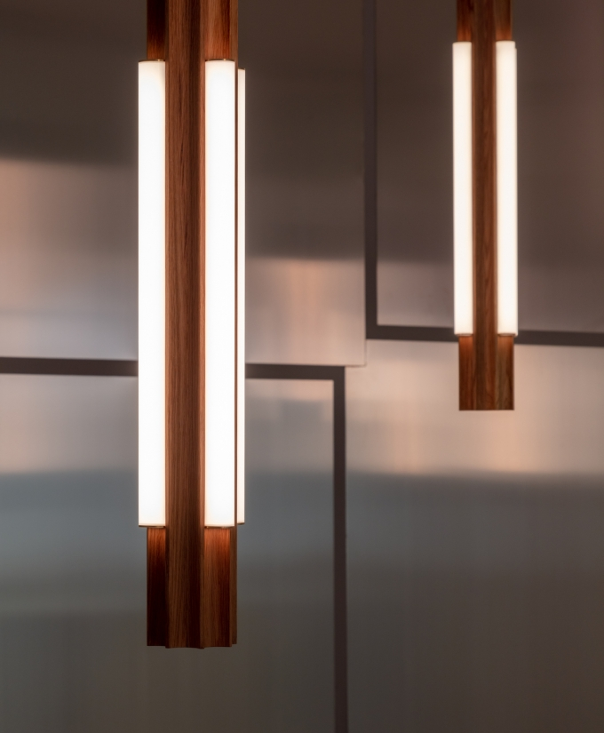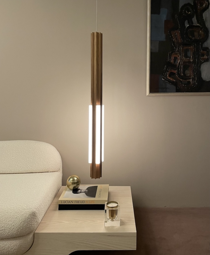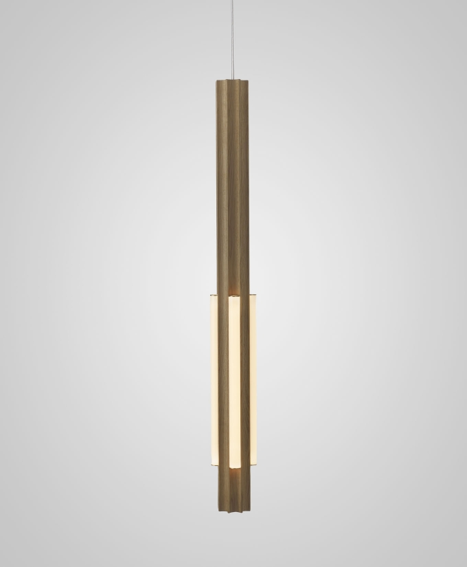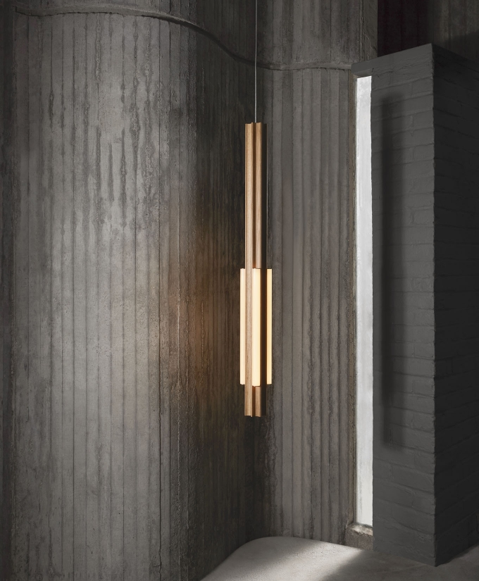 Altar is an exploration into the angular forms of Midcentury churches and altars, which often looked to warmer natural materials for fonts and pews. Altar’s elegant, fluted form is carved from solid oak and completed with an illuminated tube seamlessly nestled in its architectural grooves. The light available in two sizes, can be suspended from a cable or surface mounted to the ceiling.