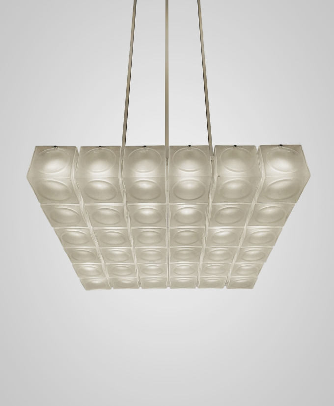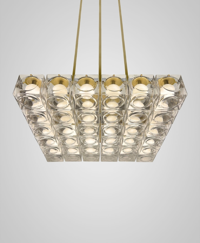 Inspired by the pressed glass bricks often used as an alternative to stained glass in places of worship during the 1970s, Chant is formed of blown glass cubes with a pronounced circular detail in either clear or frosted glass. Constructed in square configurations, the glass cubes connect to form glowing brick-like chandeliers in single or two tiers.
