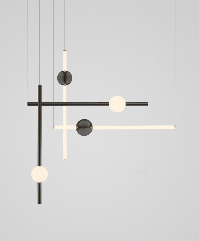 Orion comprises simple modular lights with opposing opaque and solid polished gold spheres along with opaque and solid polished gold tubes. These connect and expand horizontally and vertically to create bespoke constellations of light with infinite adaptations.