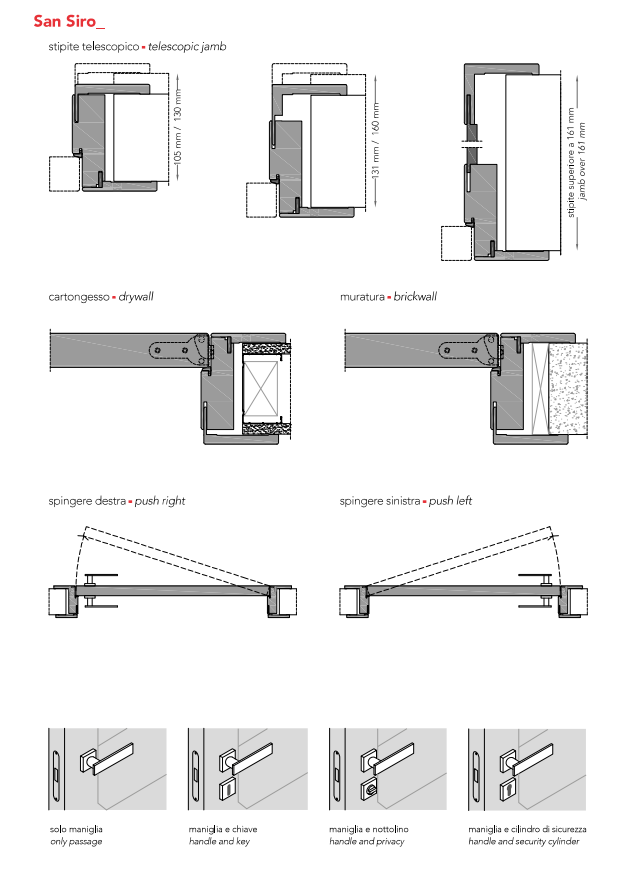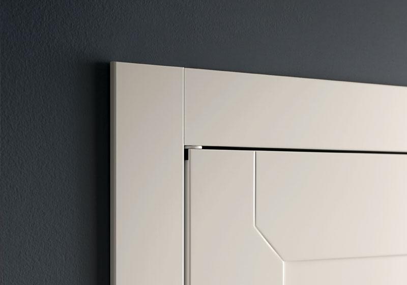 Swing wood door 41 mm thick. Magnetic lockset, concealed hinges and anti-noise gasket included. Woos jamb. Trim 12 mm thick, flush with the door on the pull side. Telescopic woos trim for wall thickness from 105 to 130 mm; available for max wall thickness 500 mm. Reversible opening direction. Concealed hinges. Mounted on traditional wooden subframe.