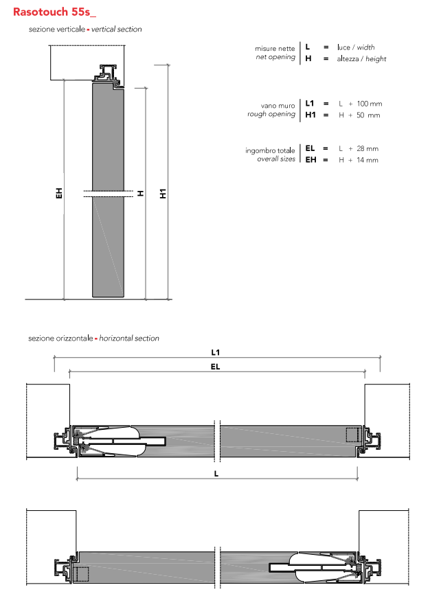 Swing wood door 55 mm thick with a concealed incorporated handle. The handle operates by pressing the vertical band, which is always lacquered in opaque color. Magnetic lockset, concealed door closer, concealed hinges and anti-noise gasket included. Aluminum frame to be installed withoutg any subframe.
