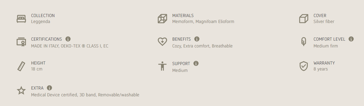Vitale Rilassante has natural antibacterial, thermal and breathable properties thanks to its cover in silver fiber. The Memoform supports the body’s every movement, adapting perfectly to its shape and providing a feeling of well-being to the spine.