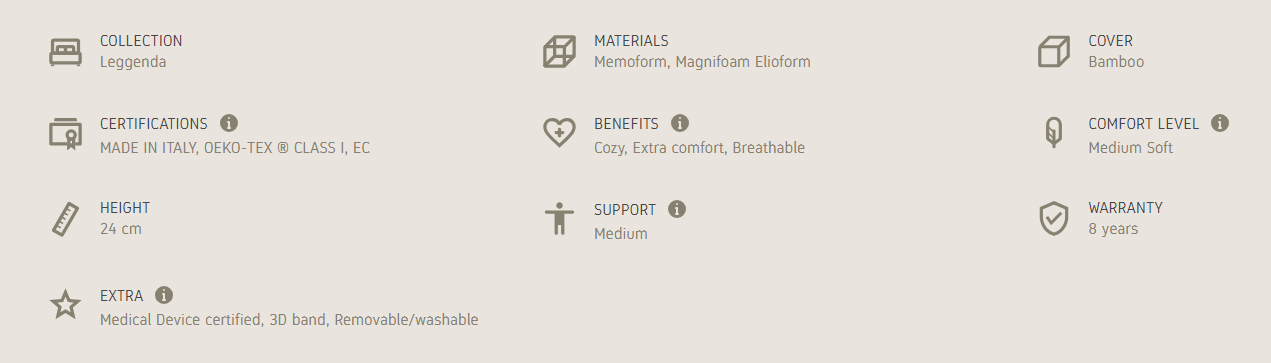 Vitale Armonioso bamboo cover ensures increased air circulation and dissipates moisture to keep the body dry throughout the night. The Memoform supports the body’s every movement, adapting perfectly to its shape and providing a feeling of well-being to the spine.