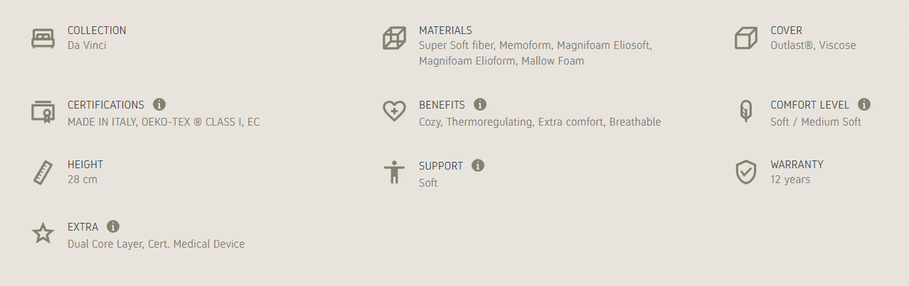 Leonardo Dual 11, of the Da Vinci collection, combines both - technique and comfort. The Dual Core technology makes it perfect for the couple that needs a different level of support. A regenerating comfort for a soft and firm support in the height of 28 cm.