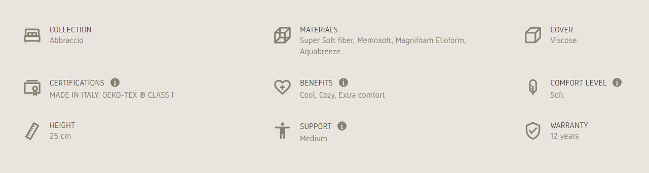 Abbraccio 10, part of the Abbraccio collection, consists of layers of Elioform and Aquabreeze and is designed to provide the right support to different parts of the body and a high degree of breathability. The Memosoft combined with the Super Soft fiber, ensures a pleasant comfort tailored to your individual needs. All at 25 cm of height.