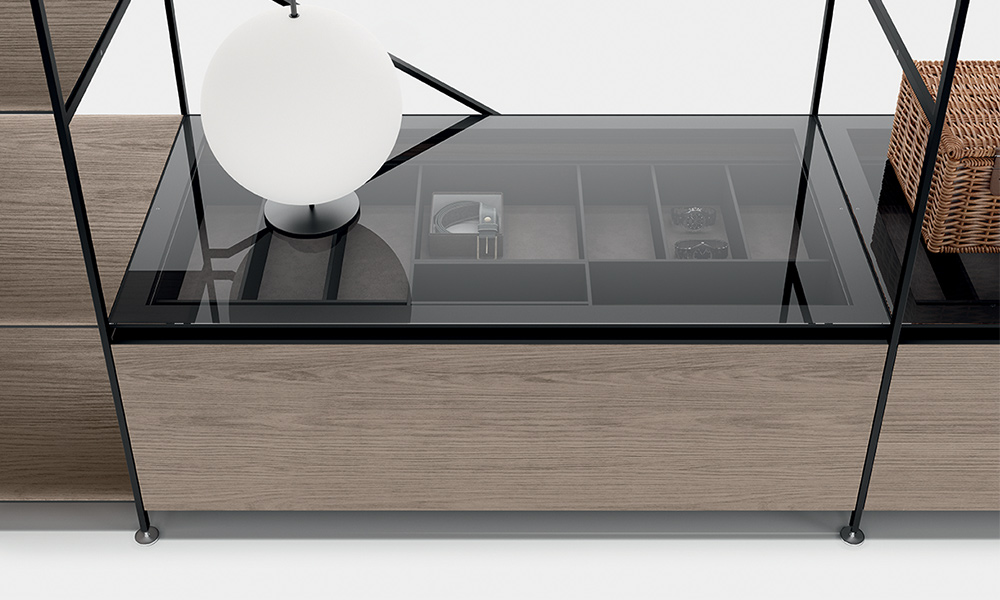The modular R.I.G. shelving system is able to transform into any number of low profile furniture solutions suitable for the living room, study, entrance hall and dining room, including television stands, small tables for lighting, credenzas and low height bookcases. To simplify: uniqueness vs. coordinated. A methodized precise concept, modelled on basic needs and the environment. R.I.G. is a system and, as such, it is both starting and landing point. In the middle of the process, choices are dictated by creativity, taste and needs. In the living area, R.I.G. can be arranged into bookcases, tabletops, low furniture for audio and video systems. It can decorate the walls or left freestanding in a room. Combines smart quality of modularity with the aesthetic value of each independent elements, because of the unique structural lightness and materials that furnish the accessories: shelves in different depths and contained modules.