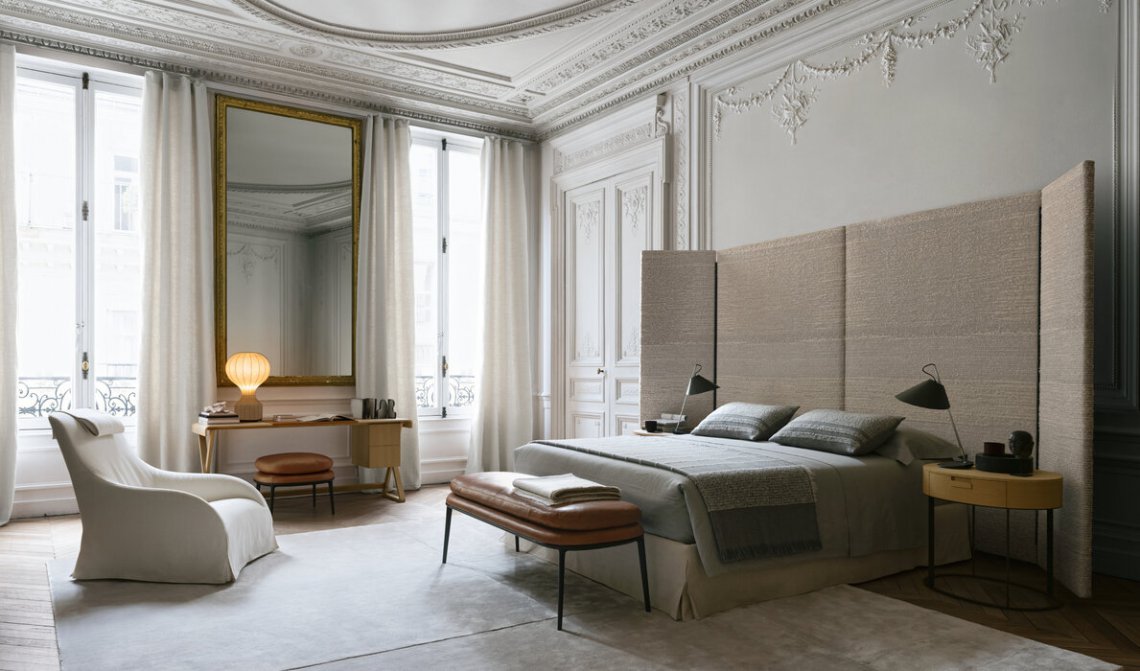 The headboard Dike with unusually-size, is a distinctive element that creates a new furniture category. Antonio Citterio imagined two panels, ending with two mobile elements, anchored by an elegant full-height hinge. This headboard becomes a theatrical backdrop or a structural element which is made even more sophisticated by the upholstery. Dike uses an ad-hoc designed fabric, with an enhanced three-dimensional and visible texture similar to a woven horizontal band tapestry making light and colour visual effects which fade gently into each other. This is a new and luxurious and refined range, hyperbolic but extremely calibrated, soft, and rational, which underlines Maxalto’s renewed desire for excellence and originality.