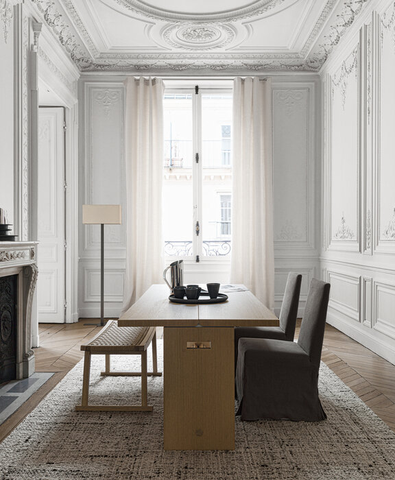Practical, discreet, and suited to a variety of environments, Cuma is a starkly linear console table that can turn into a dining table for up to eight people. A simple mechanism opens and closes the top, performing its dual function with ease. The table comes in a single size, available in various wood finishes.
