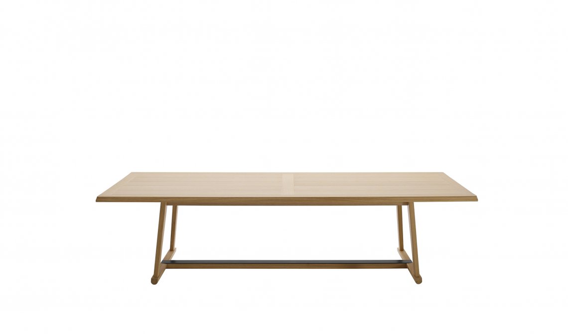 A contemporary reinterpretation of the classic refectory table, Recipio ‘14 is a rectangular wooden dining table. The top stands out for its slatted motif, while the crosspiece placed at the base is covered with a steel profile having a dual, aesthetic and protective function. The Recipio series also includes small tables, consoles and a writing desks.